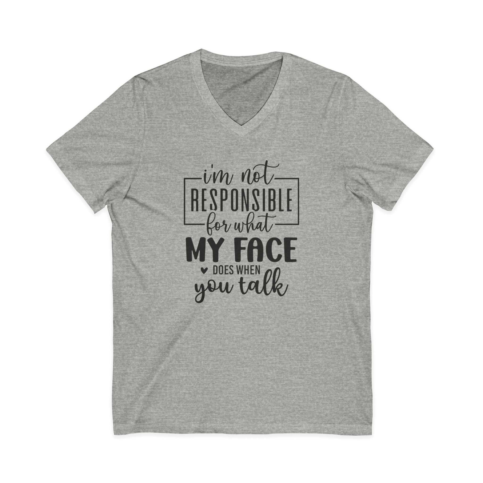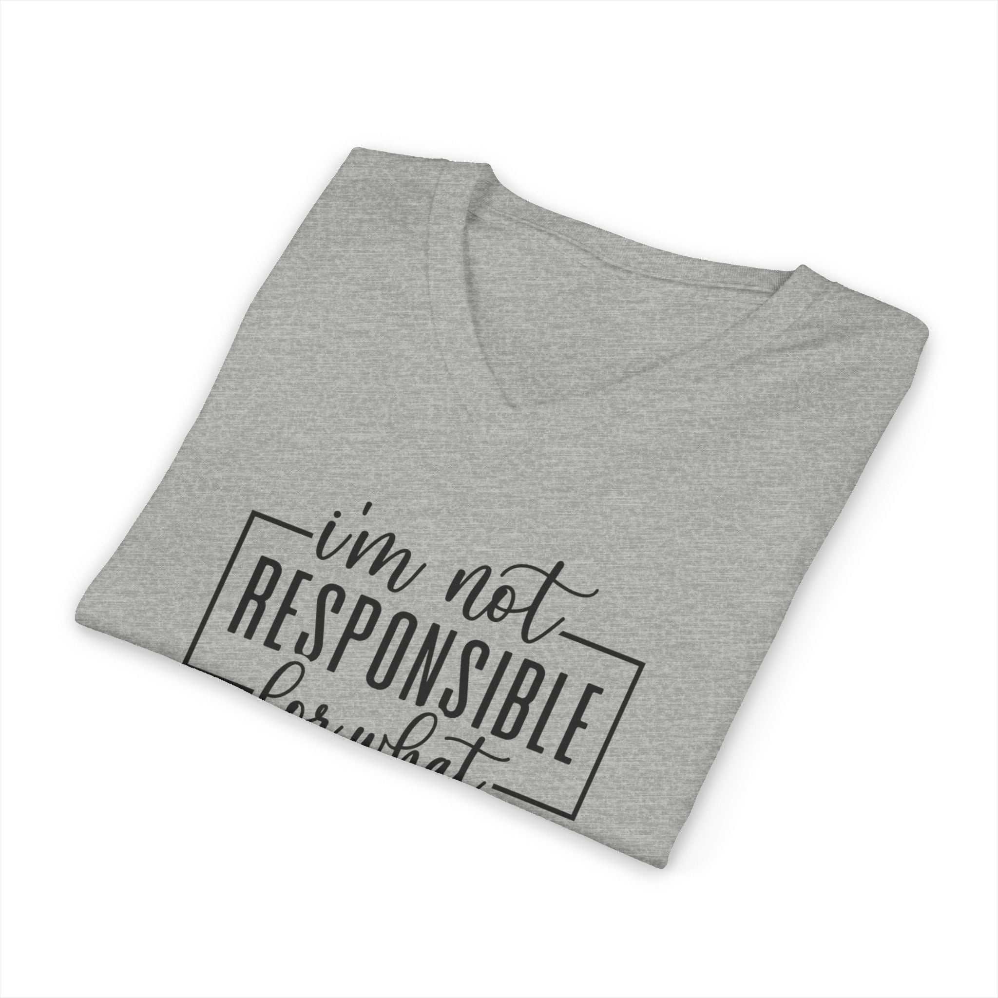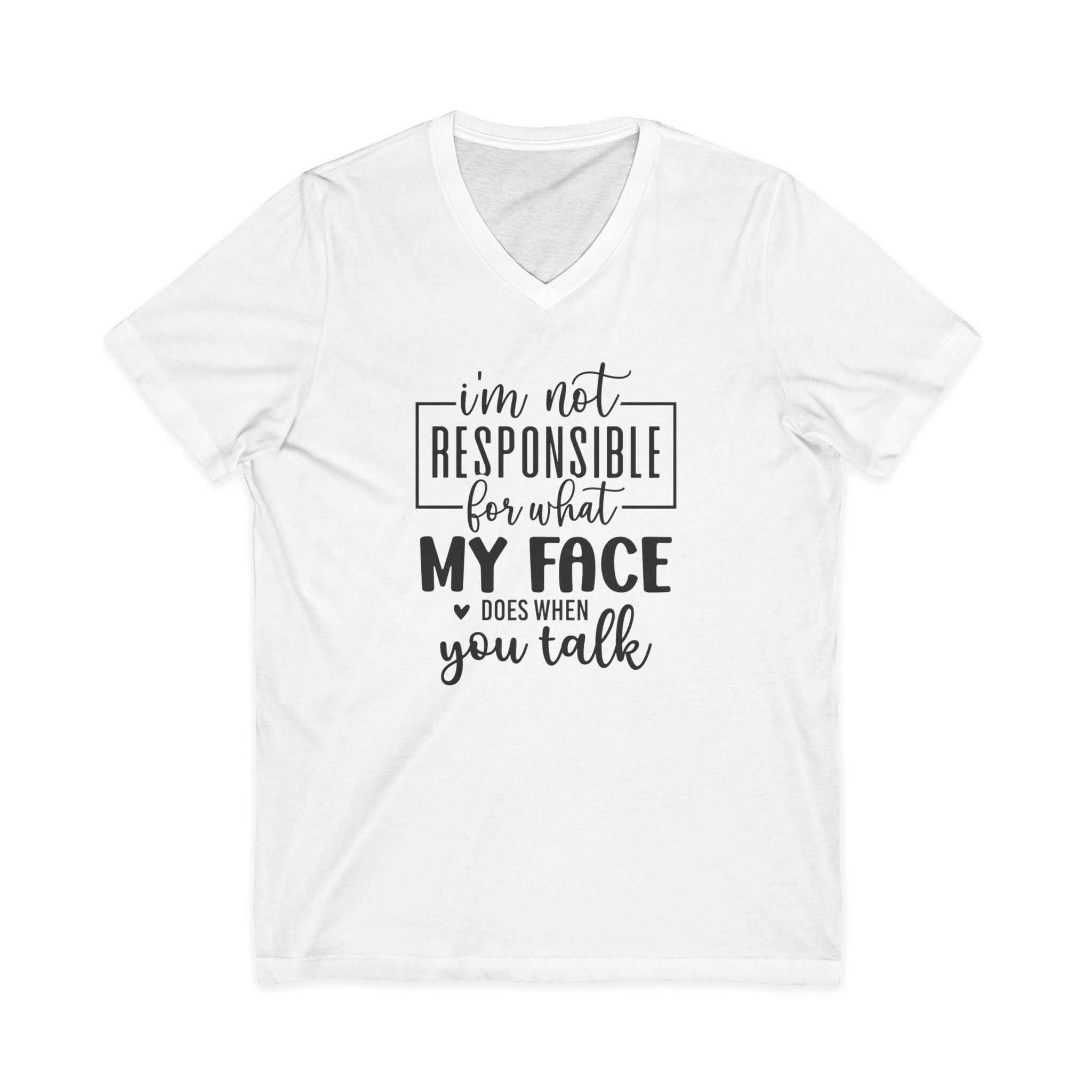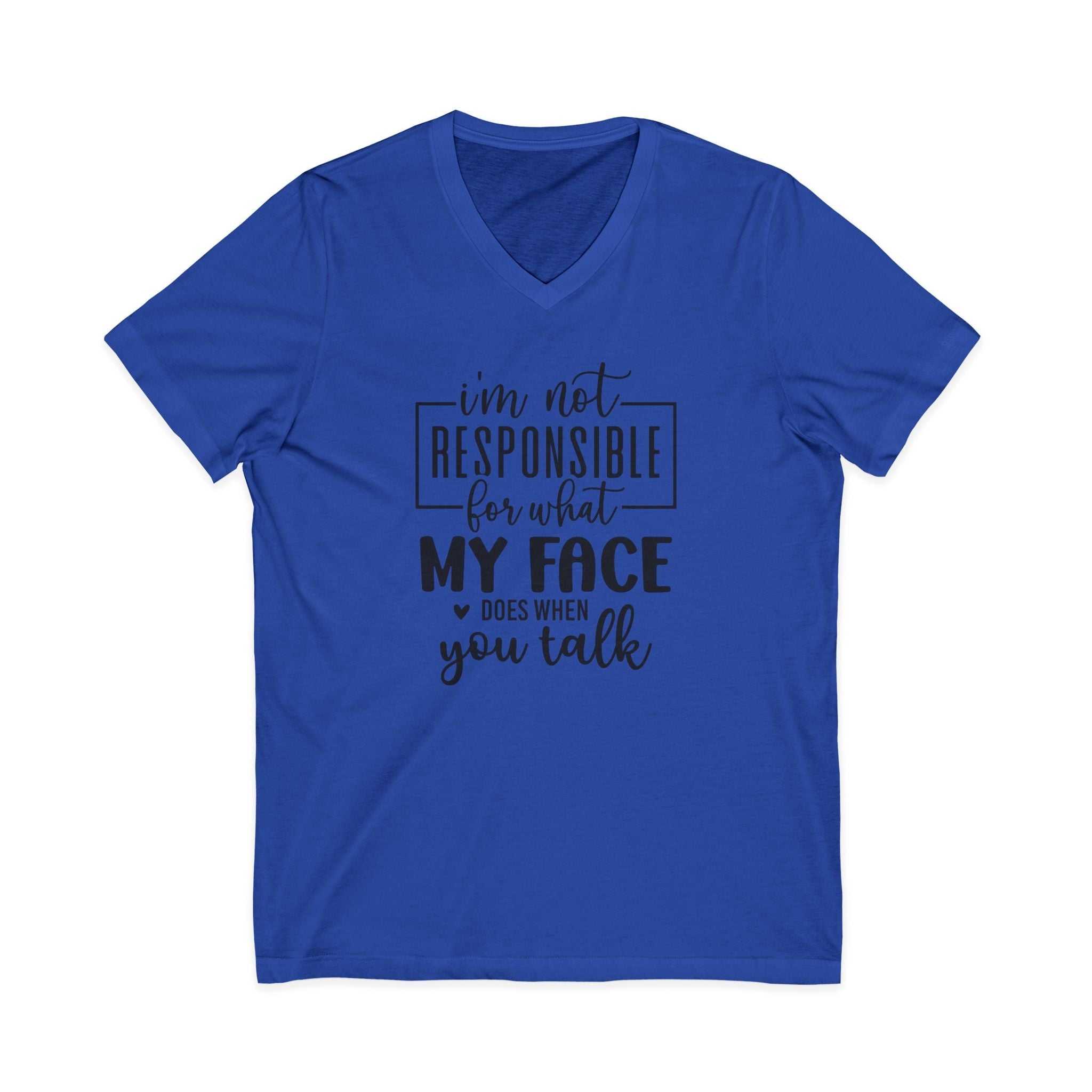 XS S M L XL 2XL 3XL Width, in 16.50 17.99 20.00 22.01 23.98 25.98 27.99 Length, in 26.73 27.72 28.74 29.72 30.75 31.73 32.72 Sleeve length, in 8.62 8.90 9.17 9.45 9.72 10.00 10.39 Lightweight, soft, and subtly sarcastic — this V-neck tee speaks before you do. The smooth 100% cotton (or blended heathers) fabric drapes into a modern retail silhouette with a flattering V neckline. Clean lines from side seams and reinforced shoulder tape keep the shirt looking sharp after repeat wear. The front text design — a deadpan, hand-lettered mix of script and bold type — reads like a private thought shared out loud. Wear it on coffee runs, long shifts, or low-key nights out when you’d rather let your expression do the talking.