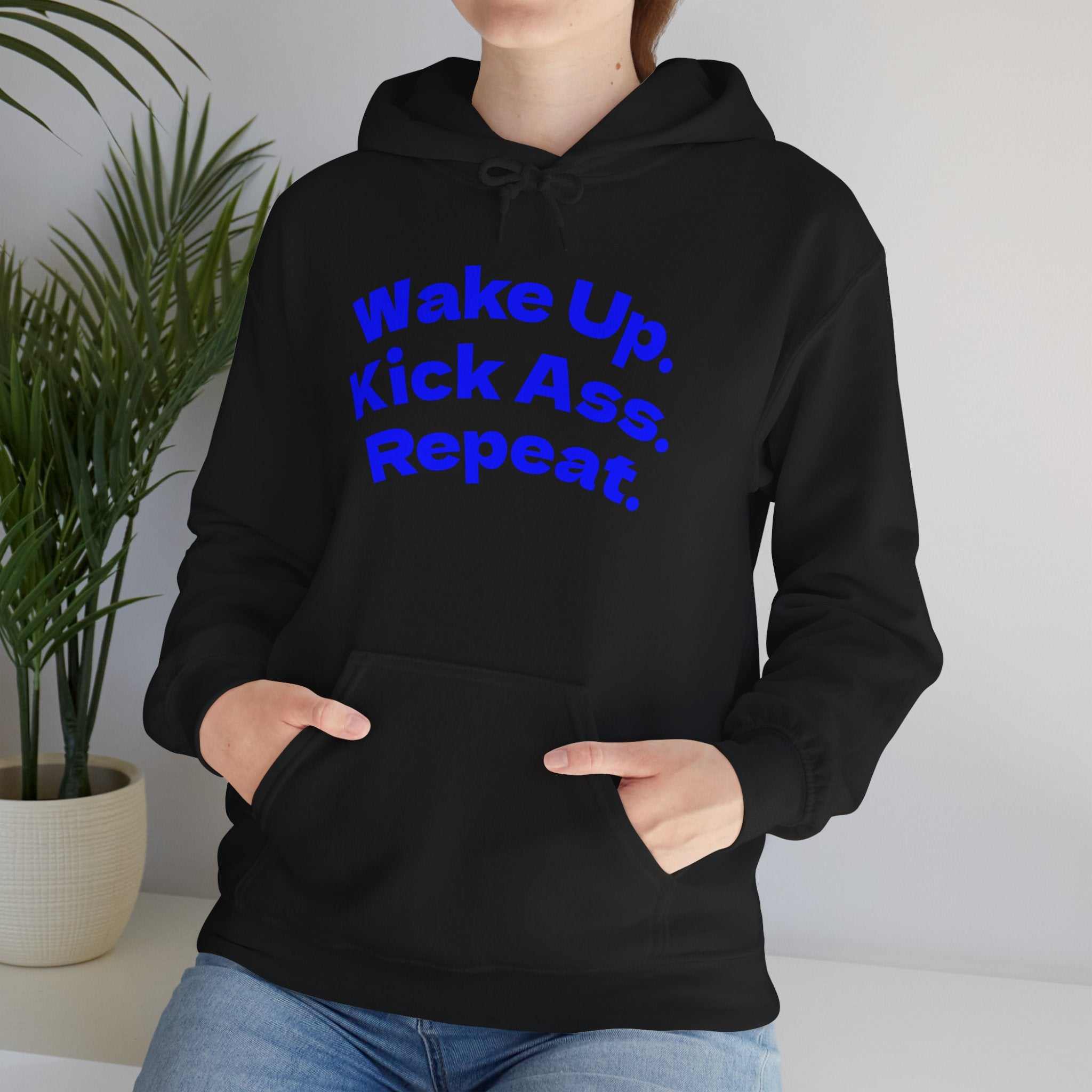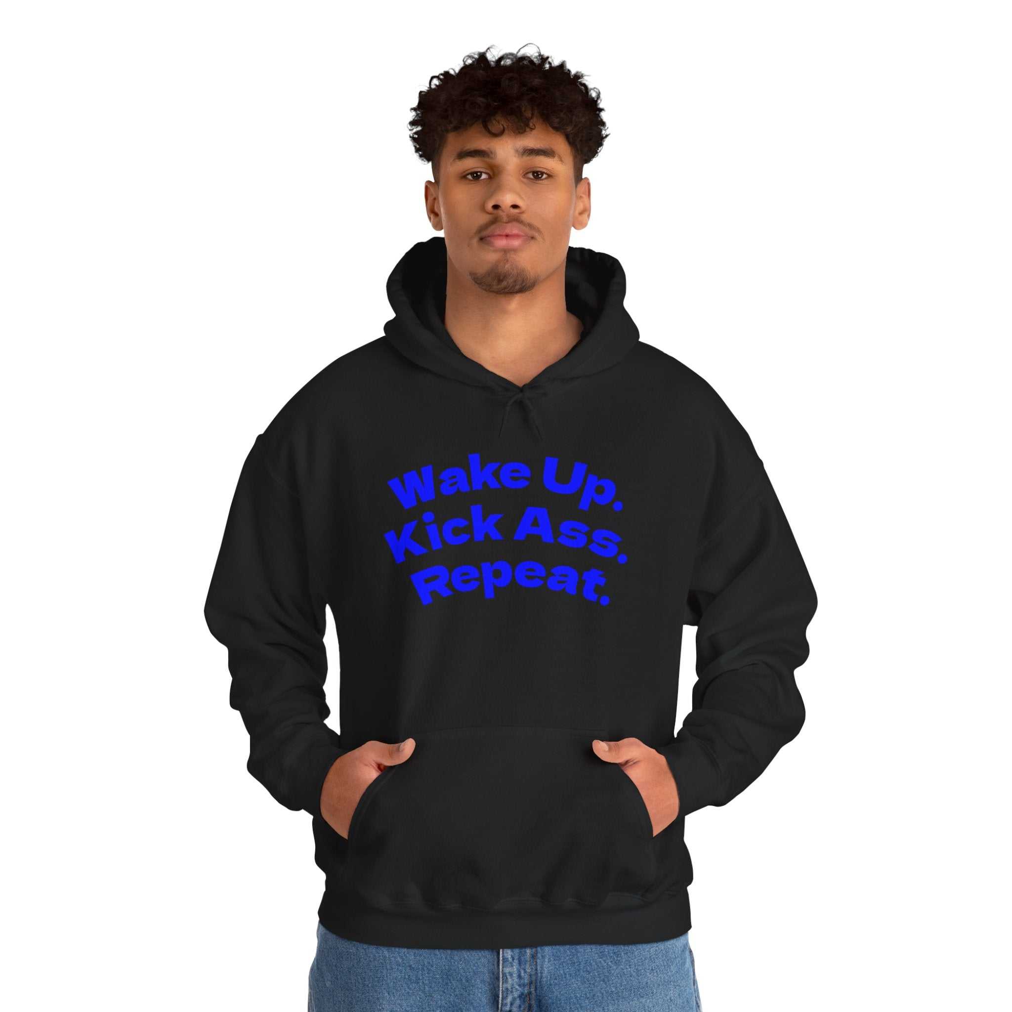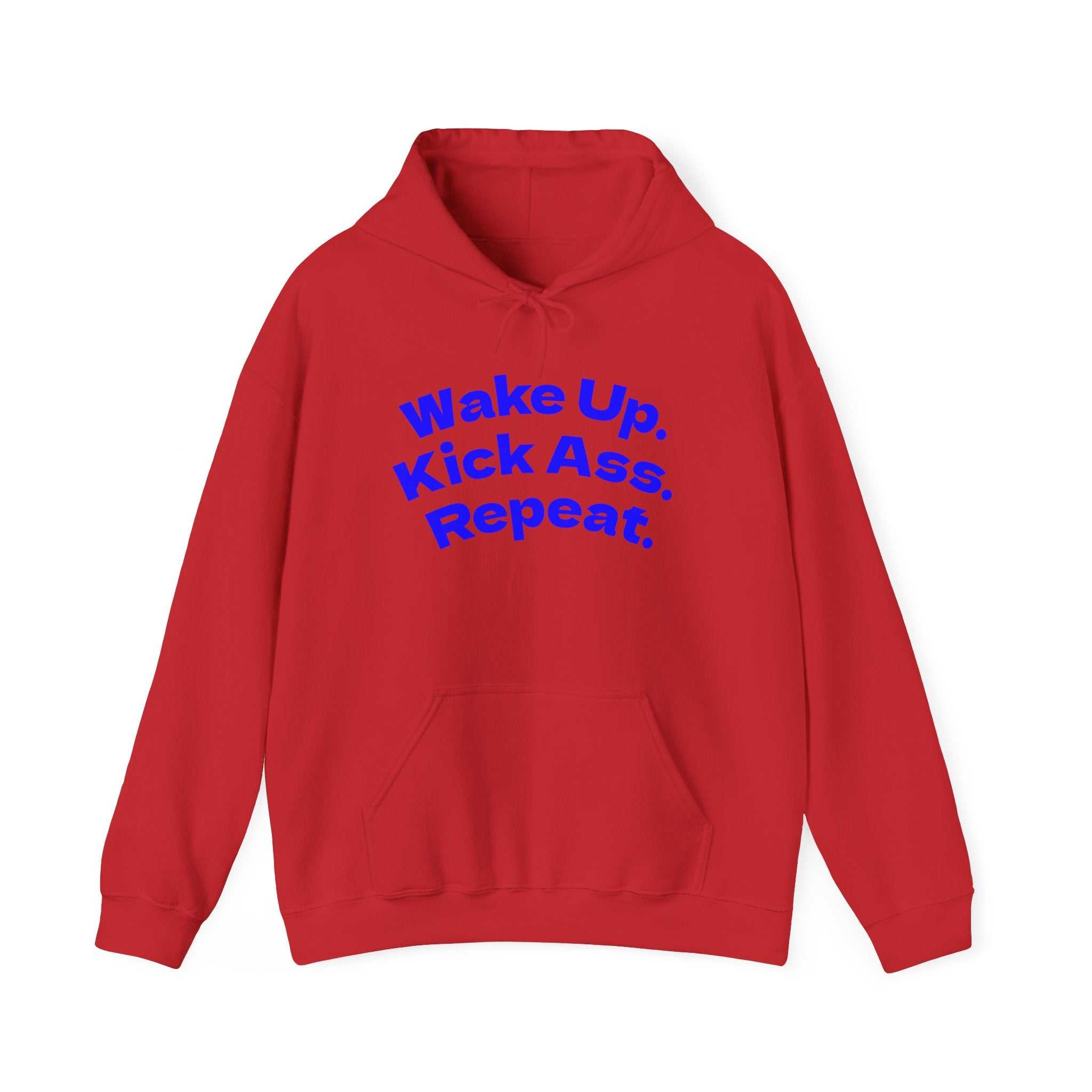 S M L XL 2XL 3XL 4XL 5XL Width, in 20.08 22.05 24.02 25.98 27.99 29.92 31.89 33.86 Length, in 27.17 27.95 29.13 29.92 31.10 31.89 33.07 33.86 Sleeve length from center back, in 33.50 34.50 35.50 36.50 37.50 38.50 39.50 40.50 Size tolerance, in 1.50 1.50 1.50 1.50 1.50 1.50 1.50 1.50 This hoodie carries a push-forward energy — a bold, confident mantra stitched across the chest that reads “Wake Up. Kick Ass. Repeat.” It settles over your shoulders like a promise: mornings that don’t wait, workouts that demand focus, hustle days that finish with quiet pride. The roomy kangaroo pocket warms hands and holds phone and keys while the double-lined hood and color-matched drawcord lock in on chilly dawn runs or late-night drive-through coffee runs. Clean, durable fabric takes the print well and keeps the message sharp, wash after wash. Wear it before a big presentation, after a tough session at the gym, or when you need that extra nudge to start the day with purpose — this hoodie feels like a teammate that refuses to let you slack.