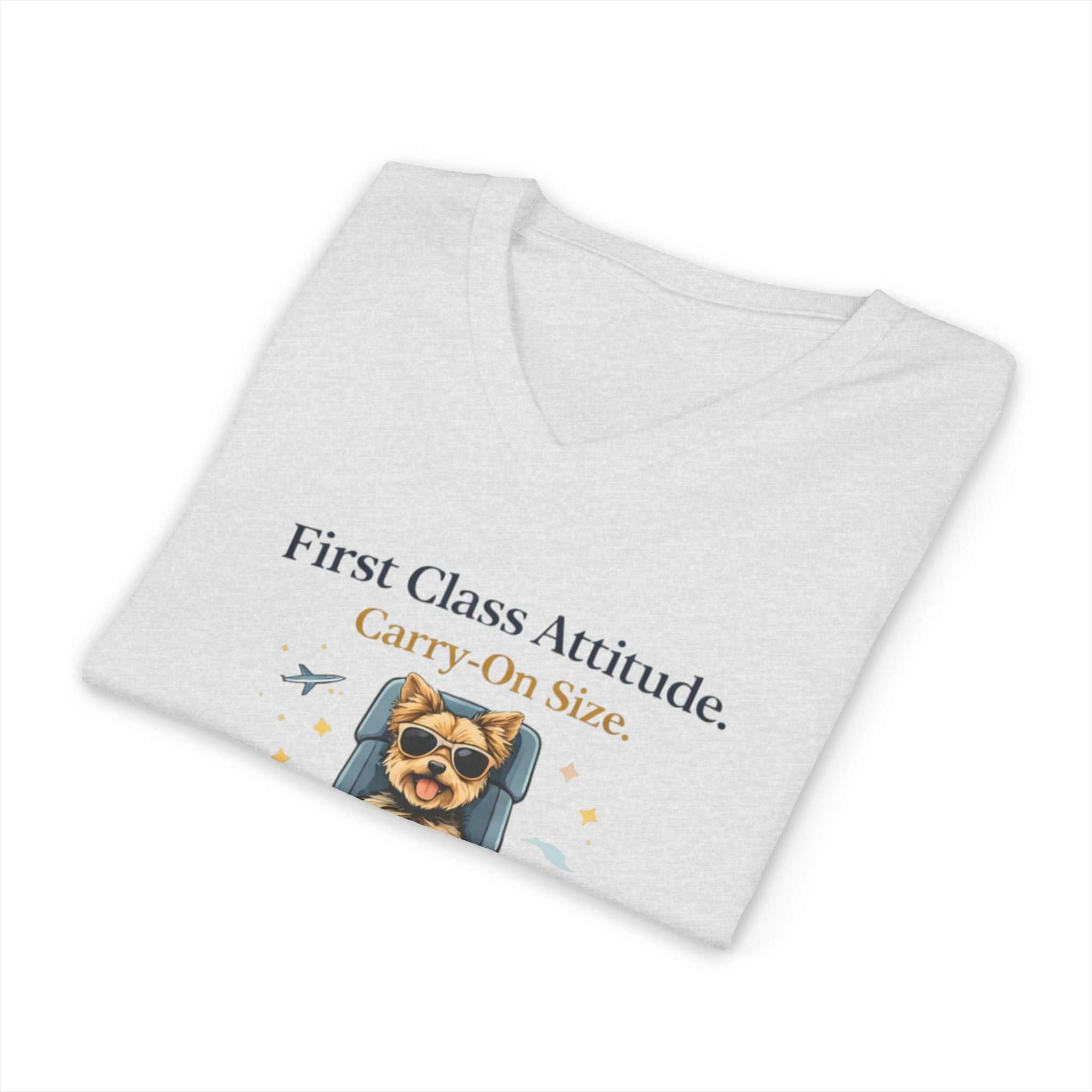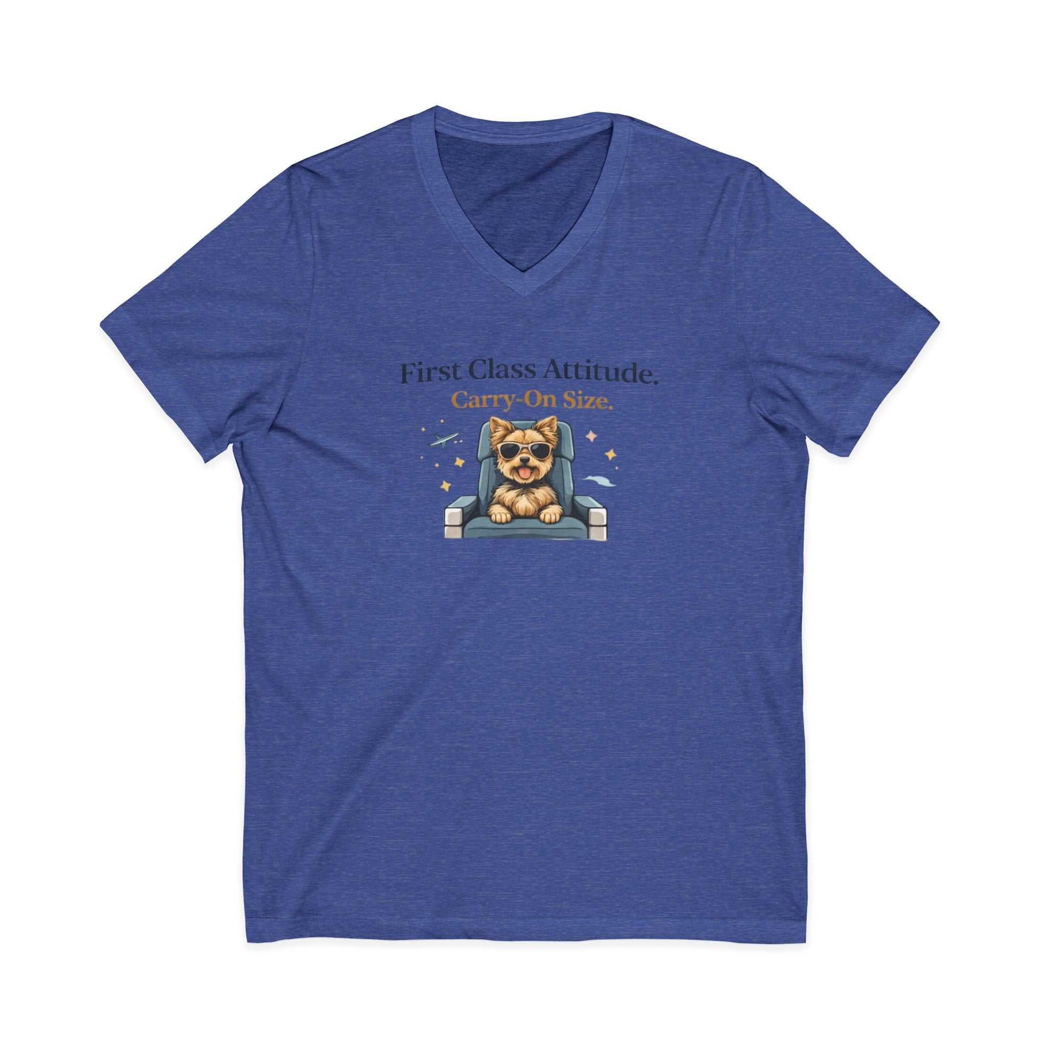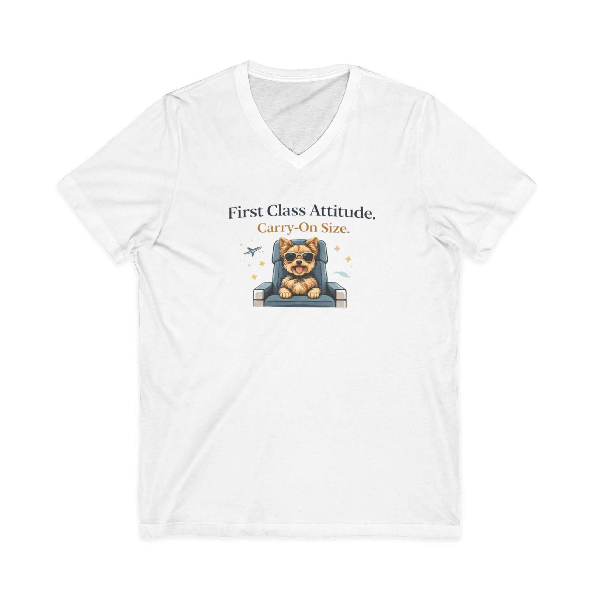 S M L XL 2XL Width, in 17.99 20.00 22.01 23.98 25.98 Length, in 27.72 28.74 29.72 30.75 31.73 Sleeve length, in 8.90 9.17 9.45 9.72 10.00 Lightweight and effortlessly playful, this V-neck tee brings a little runway attitude to everyday life. A relaxed retail fit and soft 100% cotton body (heathers blended) drape smoothly while a ribbed knit collar and shoulder tape keep the neckline and shape looking sharp. Front artwork shows a confident pup lounging in first-class style—small, witty, and surprisingly warm in tone—so it reads like a wink to fellow travelers and dog lovers alike. Wear it on travel days, casual brunches, or low-key meetups when you want something comfortable that still says, “I’ve got style (and a sense of humor).” Tear-away label and responsibly made construction add quiet comfort for regular wear.