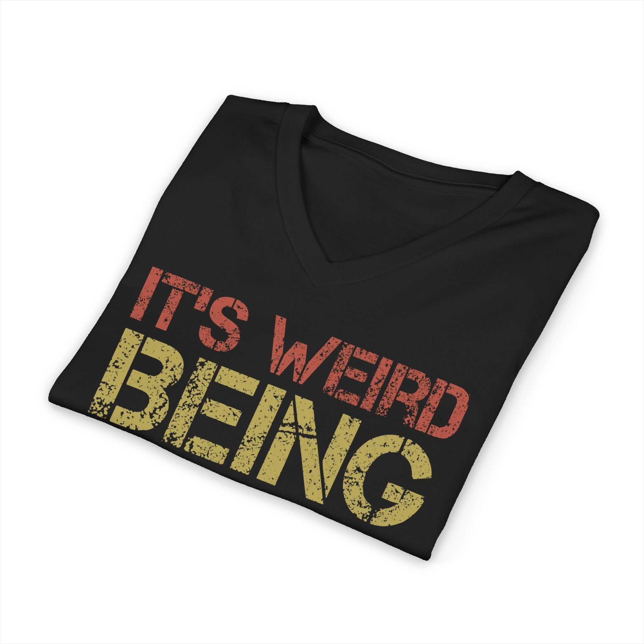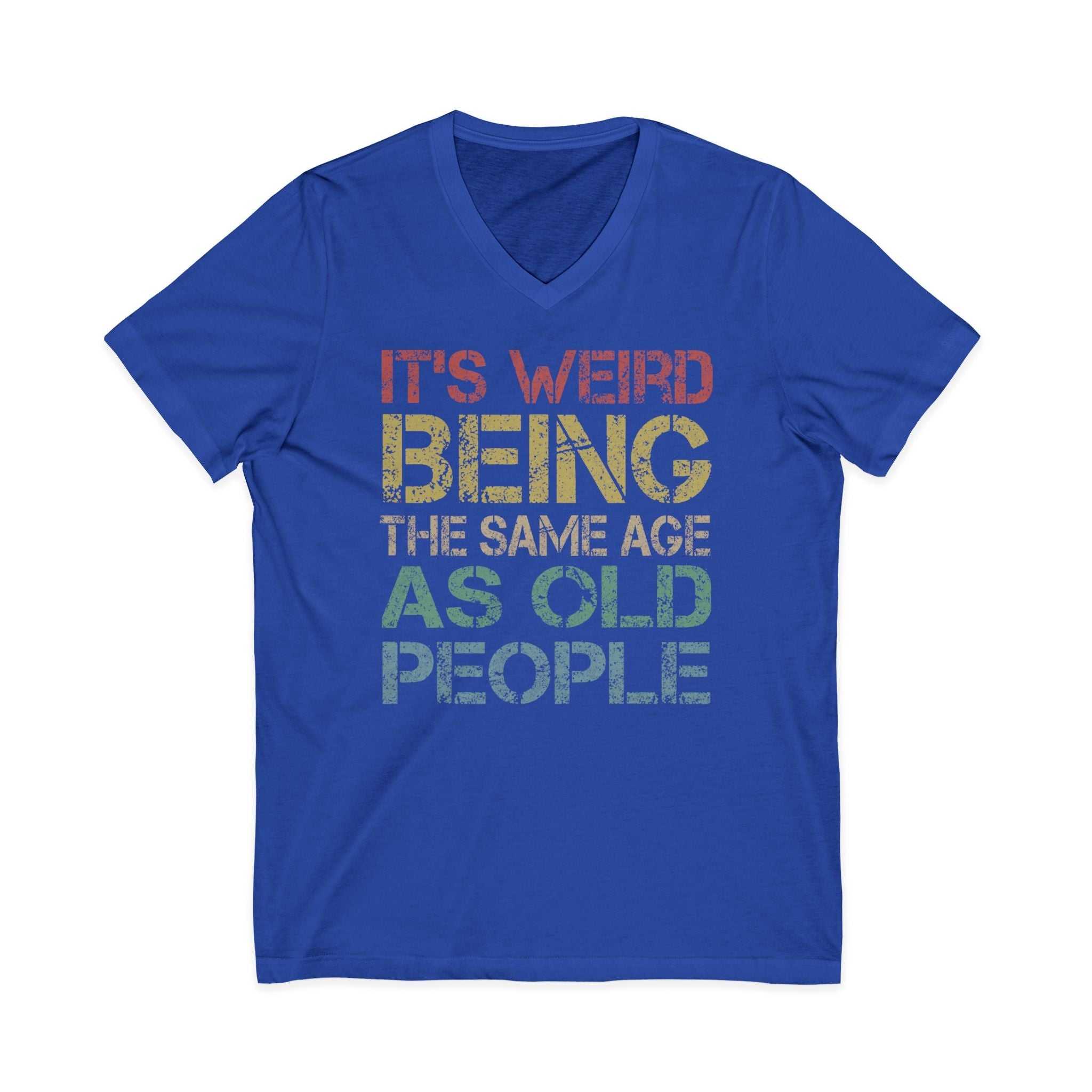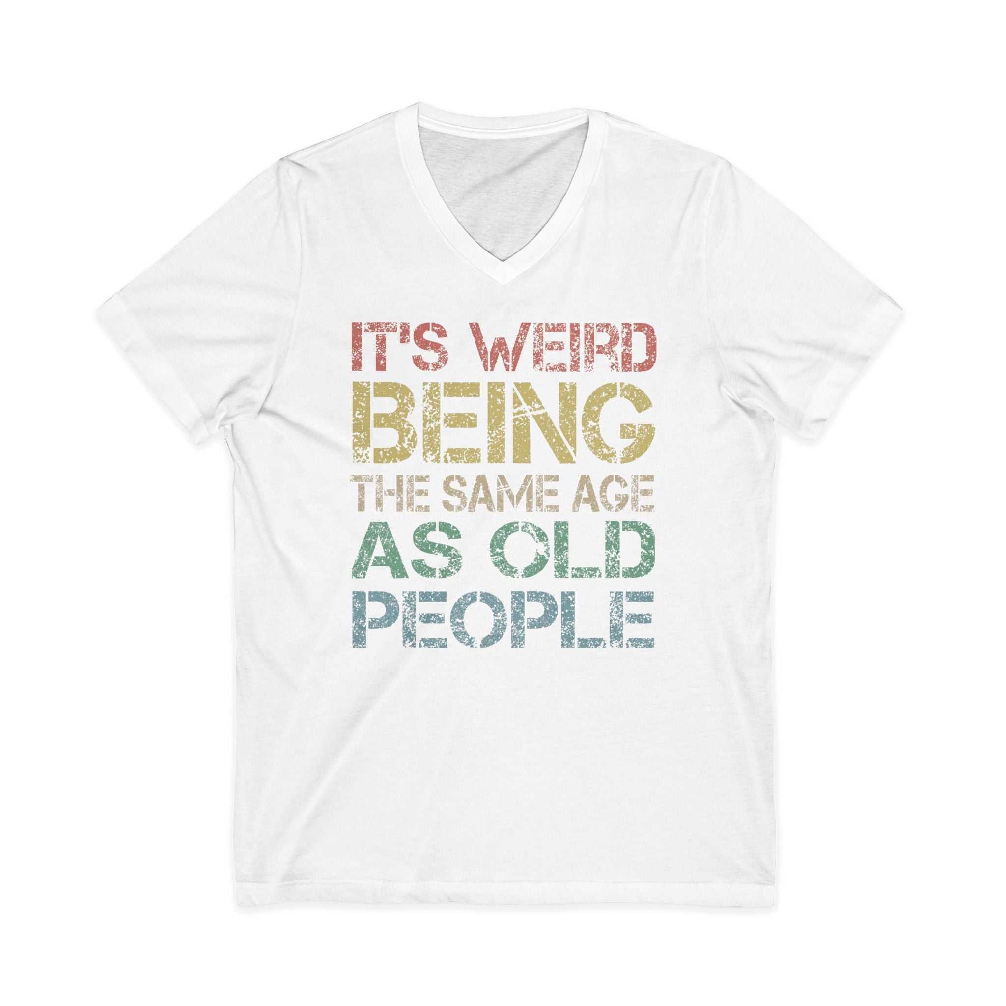 A trendy and versatile V-neck T-shirt featuring the quote 'It's Weird Being the Same Age as Old People'. This lightweight and comfortable top is perfect for any season and offers a stylish silhouette. Ideal for adults looking for a fashionable and humorous addition to their wardrobe.