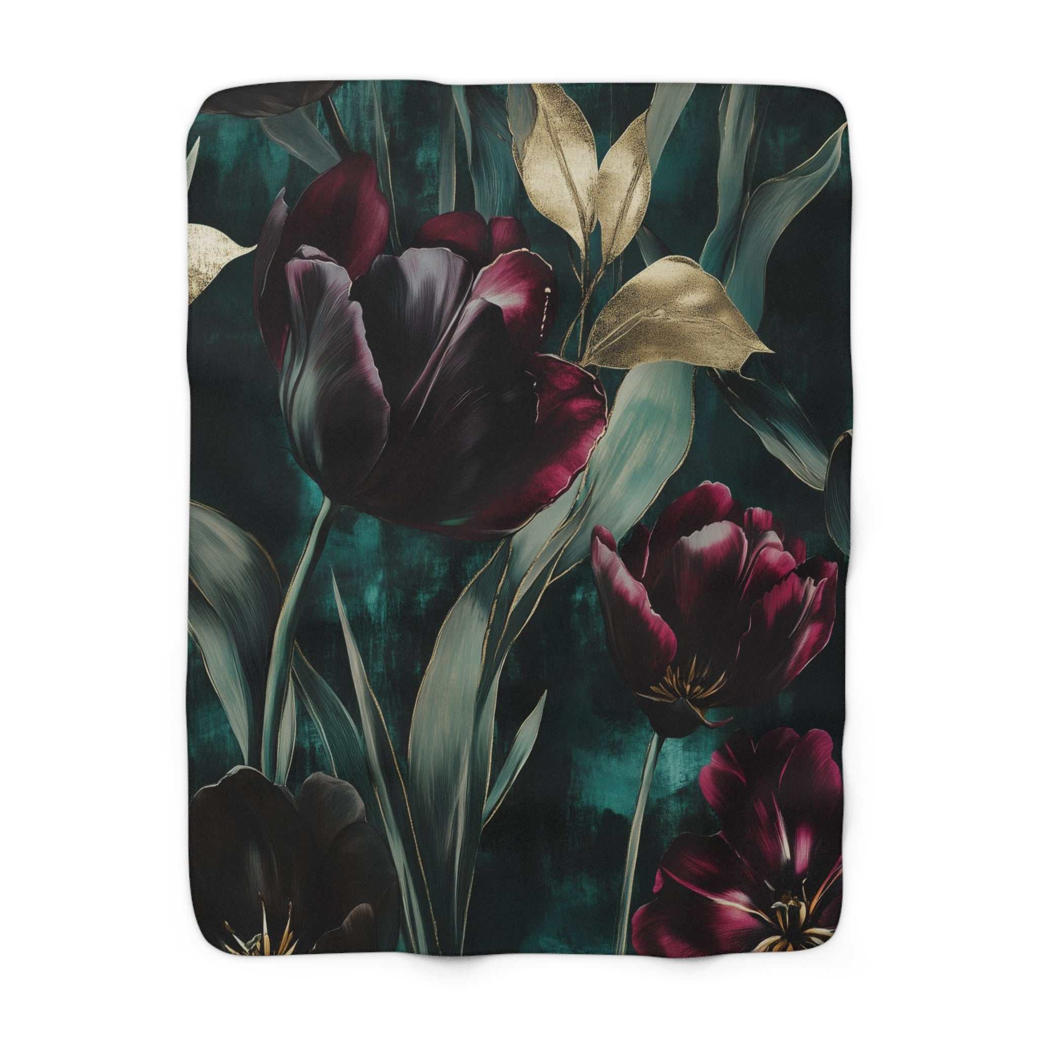 Wrap yourself in a moody, floral embrace. This plush sherpa fleece blanket pairs a velvety, deep-teal background with rich burgundy tulips and golden leaves—an artful, slightly dramatic print that turns a quiet evening into something cinematic. The sherpa backside is thick and cloud-soft, while the printed front keeps the colors vivid and painterly. Drape it over an armchair for a touch of late-night romance, curl up on the sofa during a rainstorm, or layer it on the bed for extra warmth and atmosphere. It’s designed for adults who favor refined, vintage-inspired decor and tactile comfort—people who savor slow nights, candlelight, and the hush after a long day.