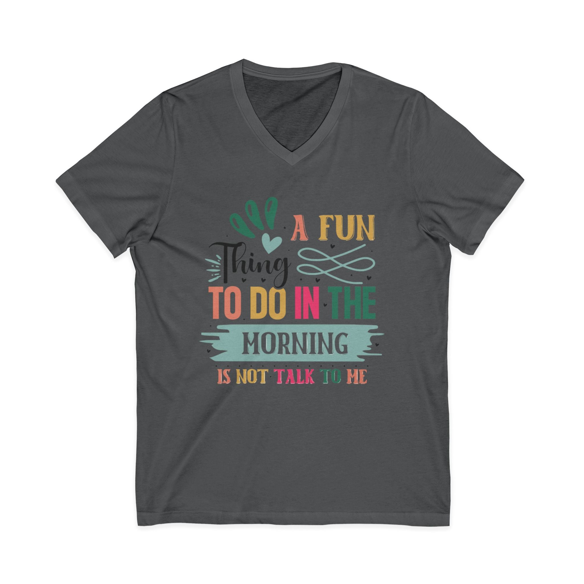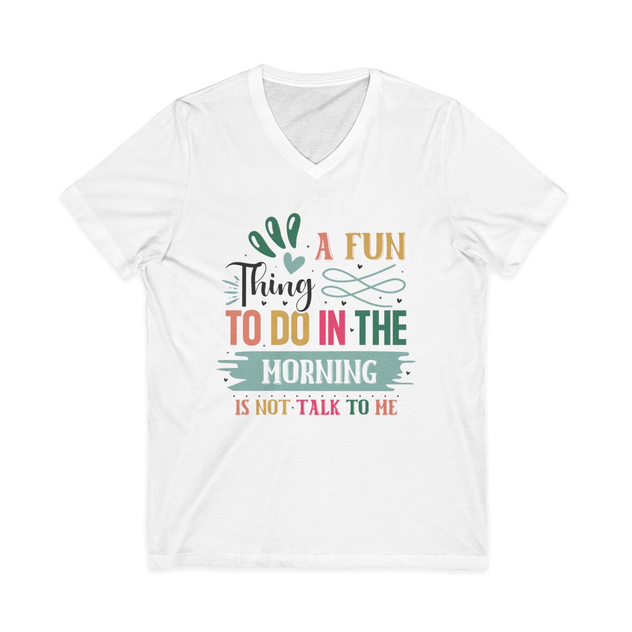 XS S M L XL 2XL 3XL Width, in 16.50 17.99 20.00 22.01 23.98 25.98 27.99 Length, in 26.73 27.72 28.74 29.72 30.75 31.73 32.72 Sleeve length, in 8.62 8.90 9.17 9.45 9.72 10.00 10.39 This Funny Thing To Do In The Morning custom v-neck t-shirt is a versatile and comfortable choice for adults. The lightweight fabric and stylish fit make it perfect for any season and setting. Ideal for those who appreciate humor and want to add a touch of fun to their daily wardrobe. Perfect for casual wear and lounging around the house. Great for gifting on birthdays, holidays, or just because.
