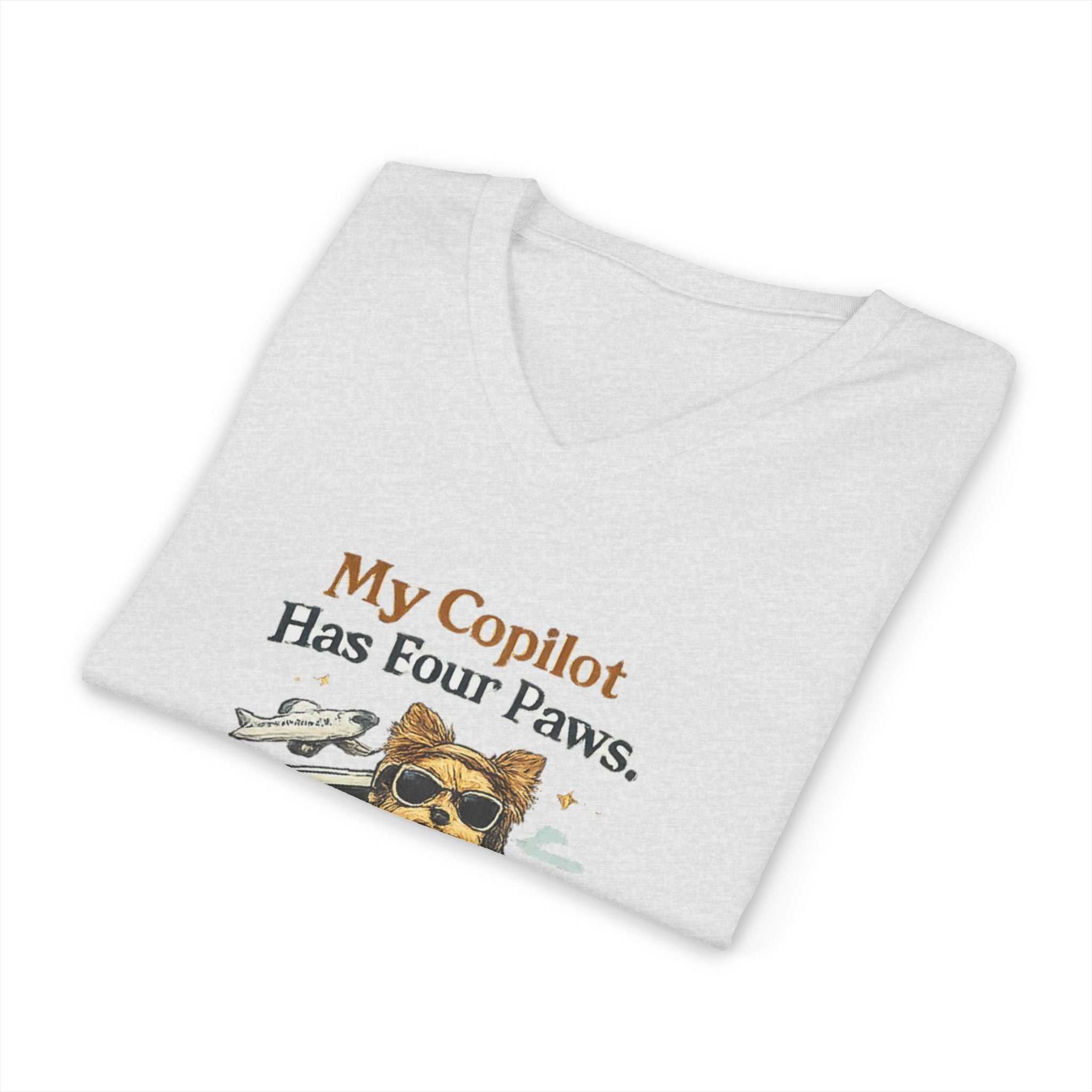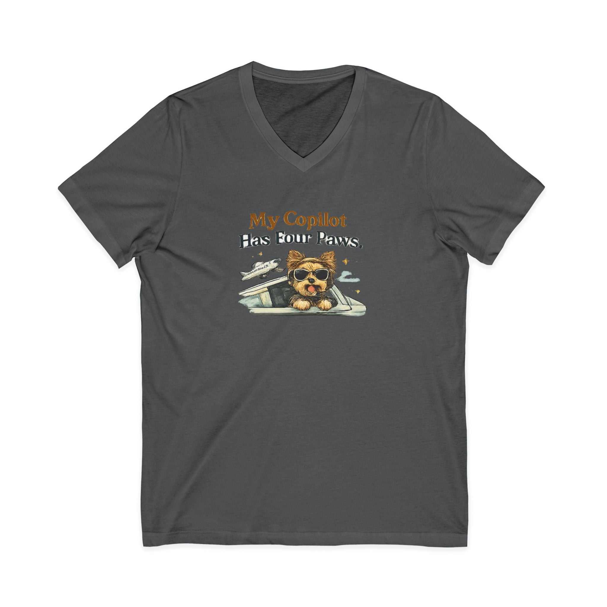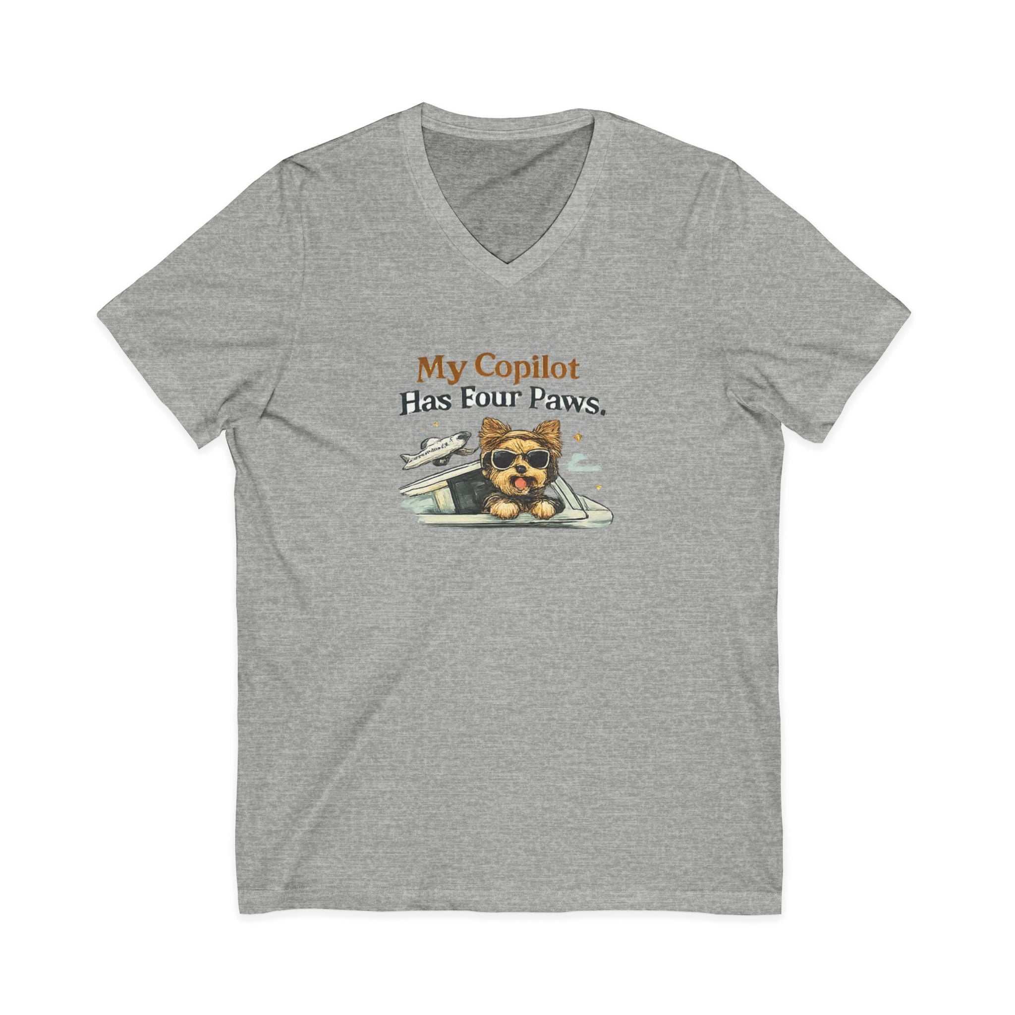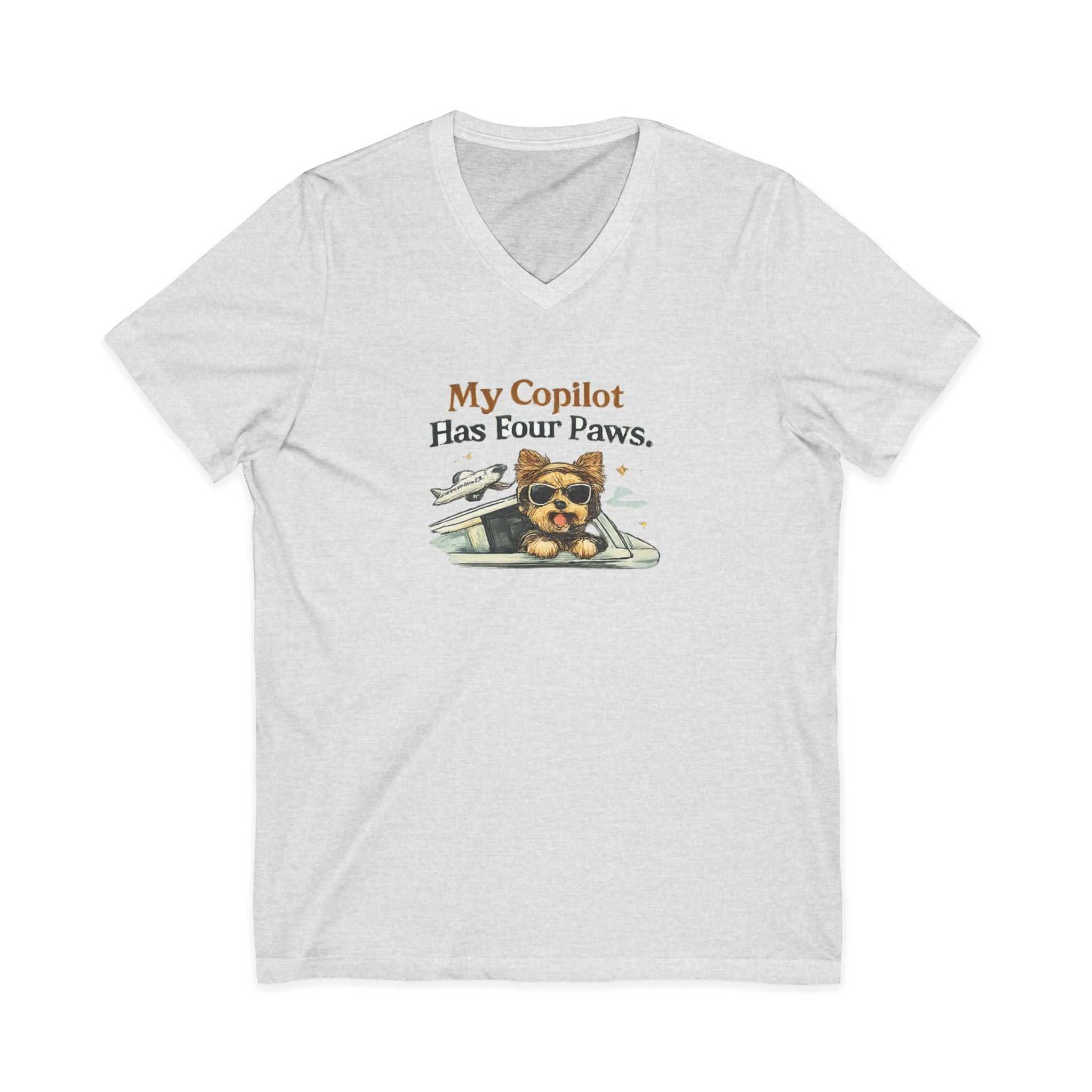S M L XL 2XL Width, in 17.99 20.00 22.01 23.98 25.98 Length, in 27.72 28.74 29.72 30.75 31.73 Sleeve length, in 8.90 9.17 9.45 9.72 10.00 This lightweight V-neck celebrates the small co-pilot who always sneaks into the passenger seat. Soft 100% cotton (heathers blended) drapes in a flattering retail fit while the ribbed collar and shoulder tape keep the tee looking sharp wash after wash. The front artwork — a relaxed pup peeking over a dashboard with the words “My Copilot Has Four Paws” — feels like a quiet, sunny drive with your dog. Wear it on morning errands, weekend road trips, or low-key meetups with other dog lovers; it’s casual, comfortable, and made with mindful manufacturing standards.