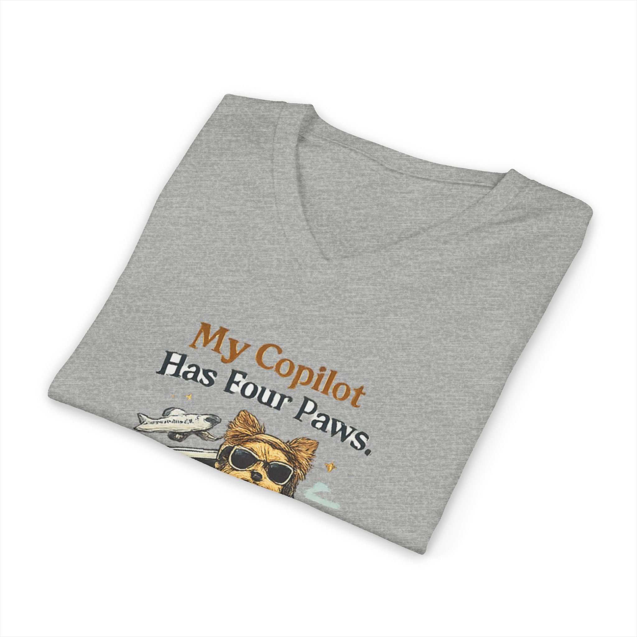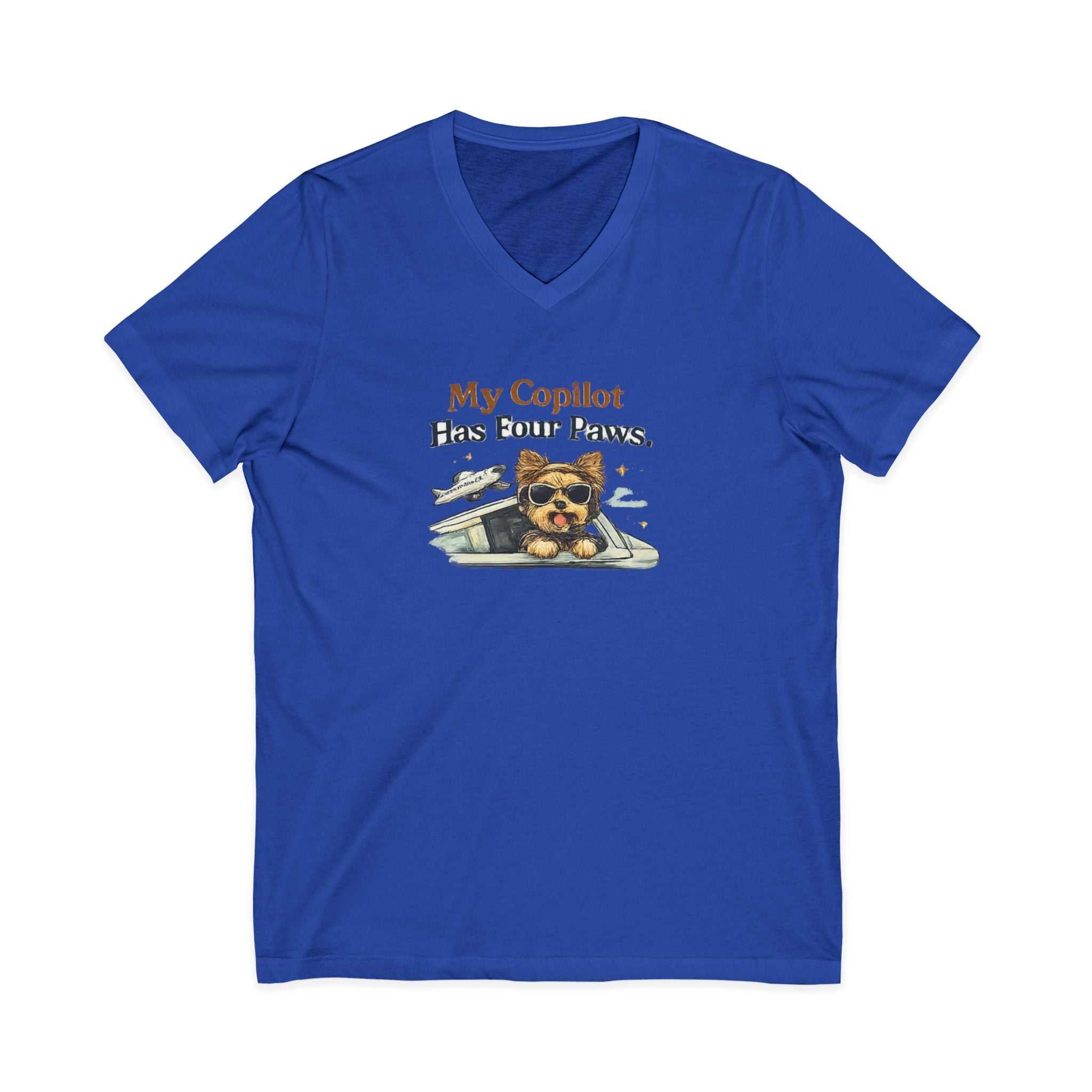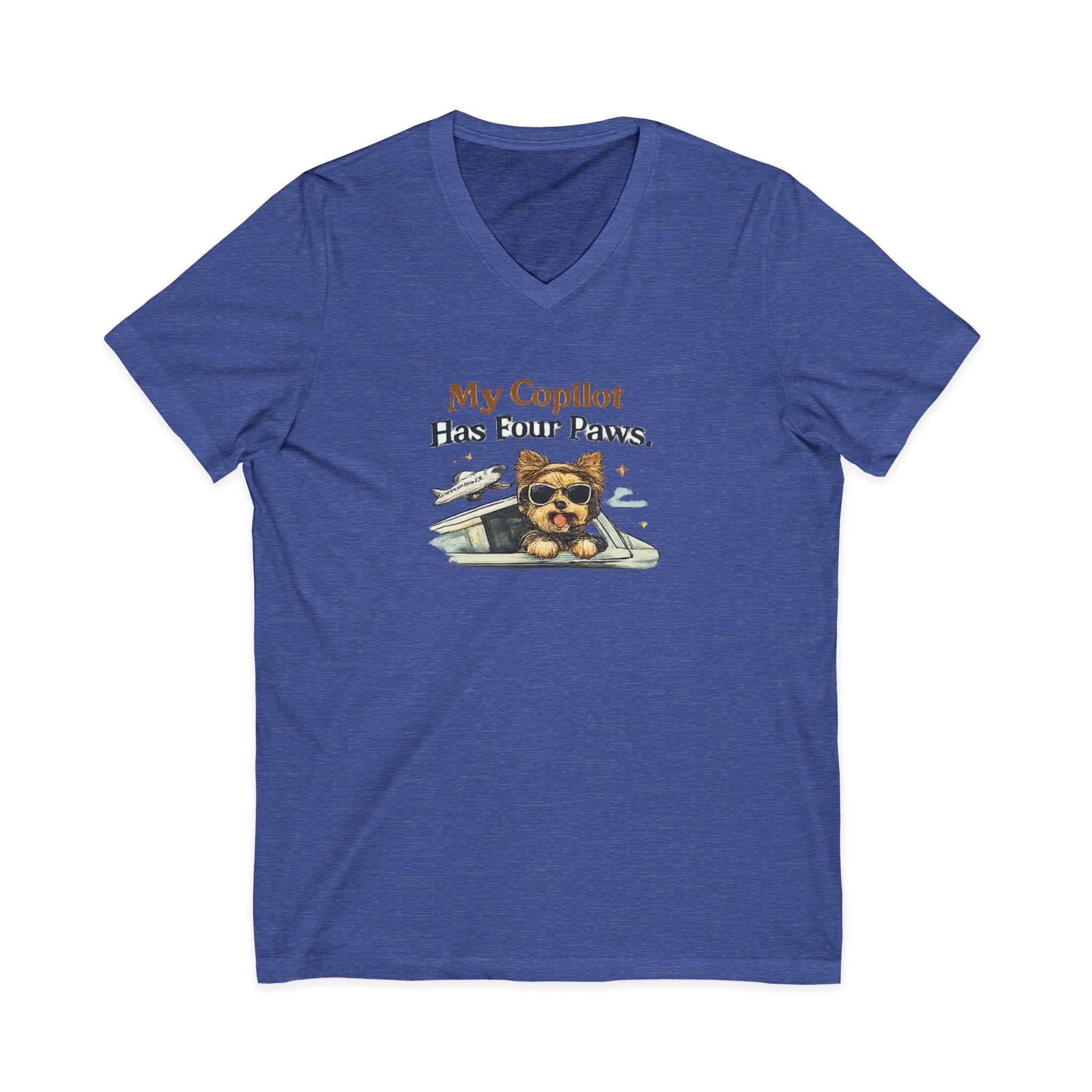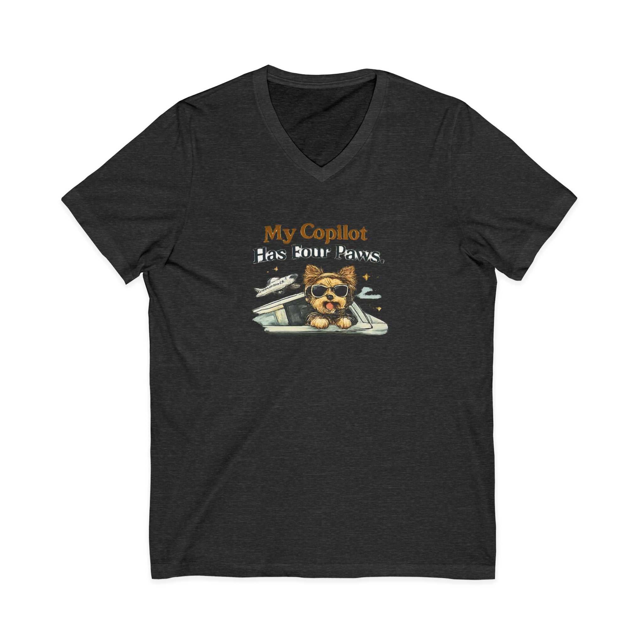 S M L XL 2XL Width, in 17.99 20.00 22.01 23.98 25.98 Length, in 27.72 28.74 29.72 30.75 31.73 Sleeve length, in 8.90 9.17 9.45 9.72 10.00 This lightweight V-neck celebrates the small co-pilot who always sneaks into the passenger seat. Soft 100% cotton (heathers blended) drapes in a flattering retail fit while the ribbed collar and shoulder tape keep the tee looking sharp wash after wash. The front artwork — a relaxed pup peeking over a dashboard with the words “My Copilot Has Four Paws” — feels like a quiet, sunny drive with your dog. Wear it on morning errands, weekend road trips, or low-key meetups with other dog lovers; it’s casual, comfortable, and made with mindful manufacturing standards.
