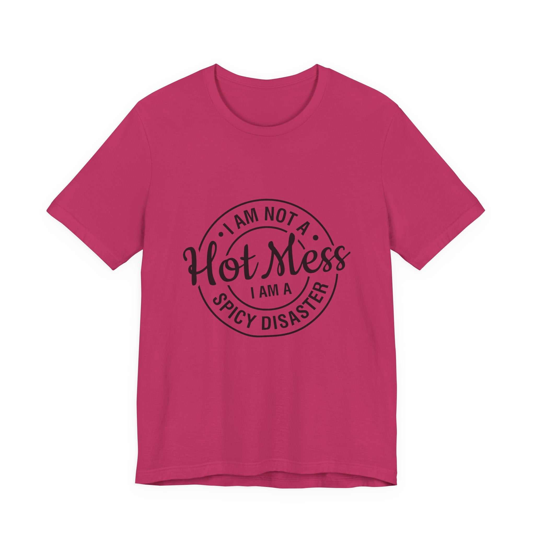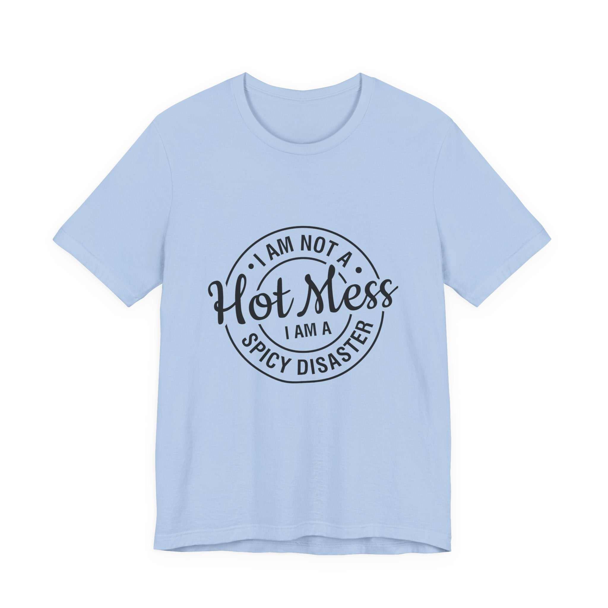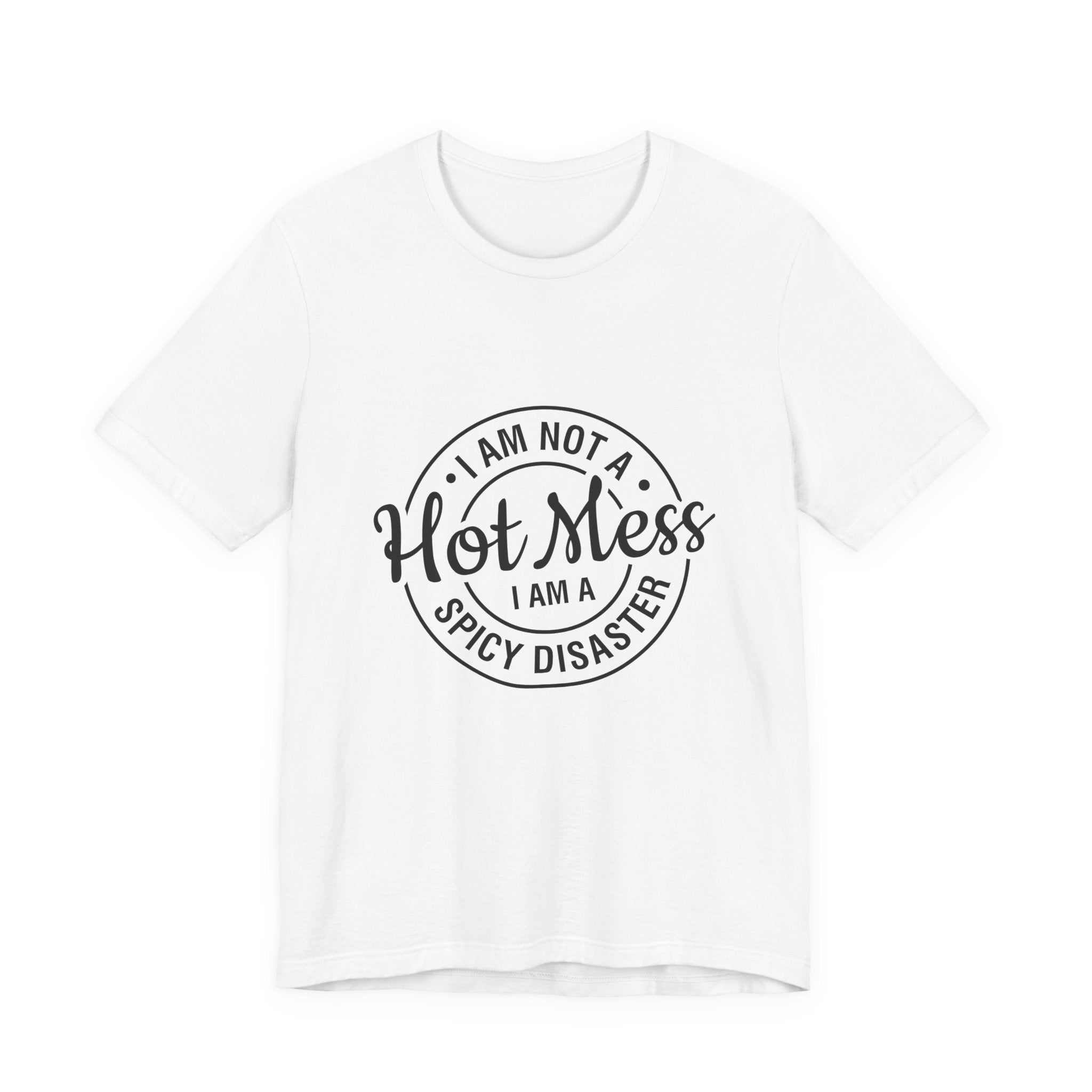 S M L XL 2XL 3XL Width, in 18.00 20.00 22.00 24.00 26.00 28.00 Length, in 28.00 29.00 30.00 31.00 32.00 33.00 Sleeve length, in 8.90 9.20 9.50 9.70 10.00 10.40 Size tolerance, in 1.50 1.50 1.50 1.50 1.50 1.50 This lightweight jersey tee carries a cheeky, hand-lettered badge that reads "I am not a Hot Mess — I am a Spicy Disaster." The soft, breathable cotton keeps you comfortable through errands, kitchen experiments, and late-night takeout runs while the subtle monochrome print adds playful attitude without shouting. It layers easily under a denim jacket or slips on solo for an off-duty look that says you’re confident, a little chaotic, and fully embracing it. The retail fit and classic crew neckline make it simple to style for everyday wear or casual gatherings where humor and personality matter more than polish.