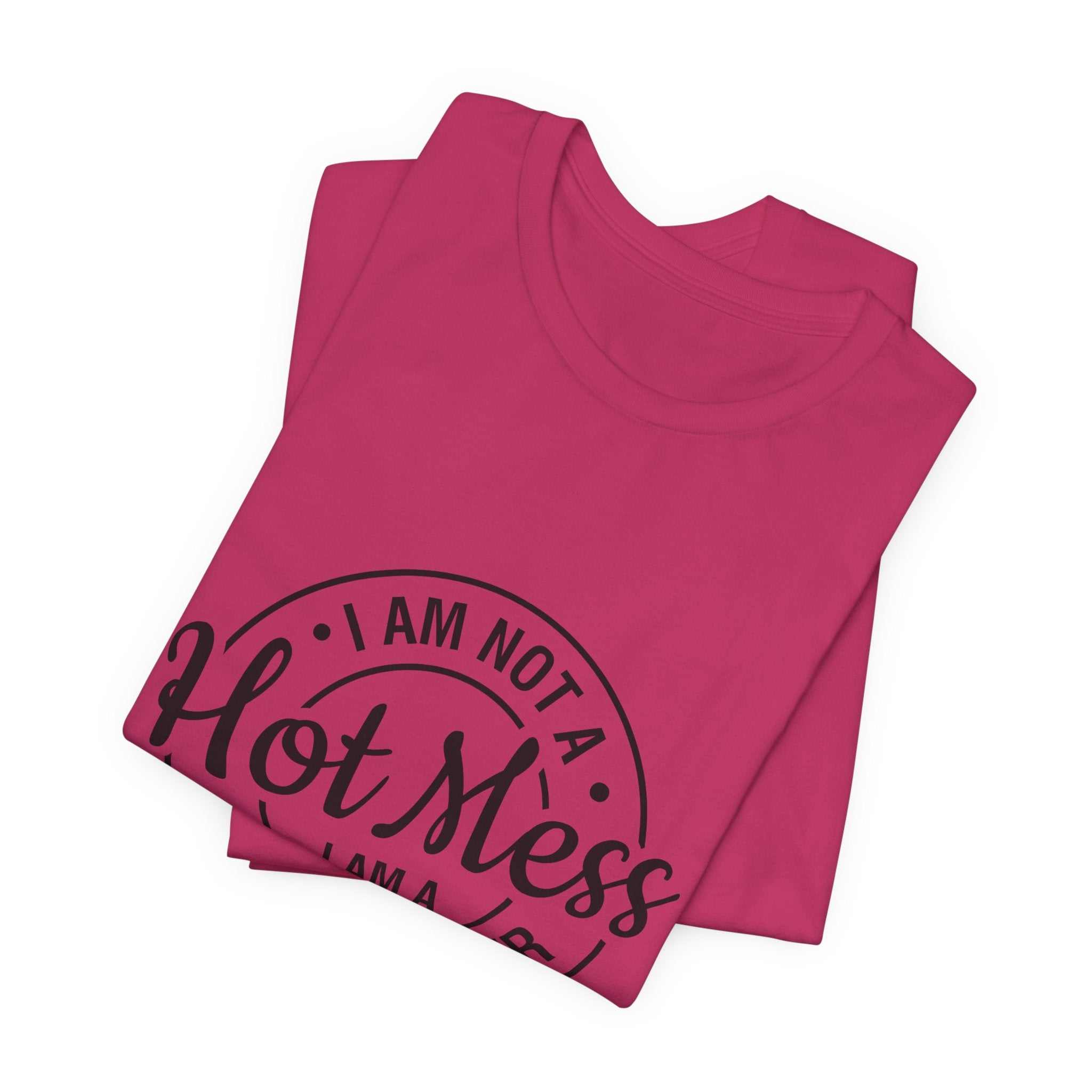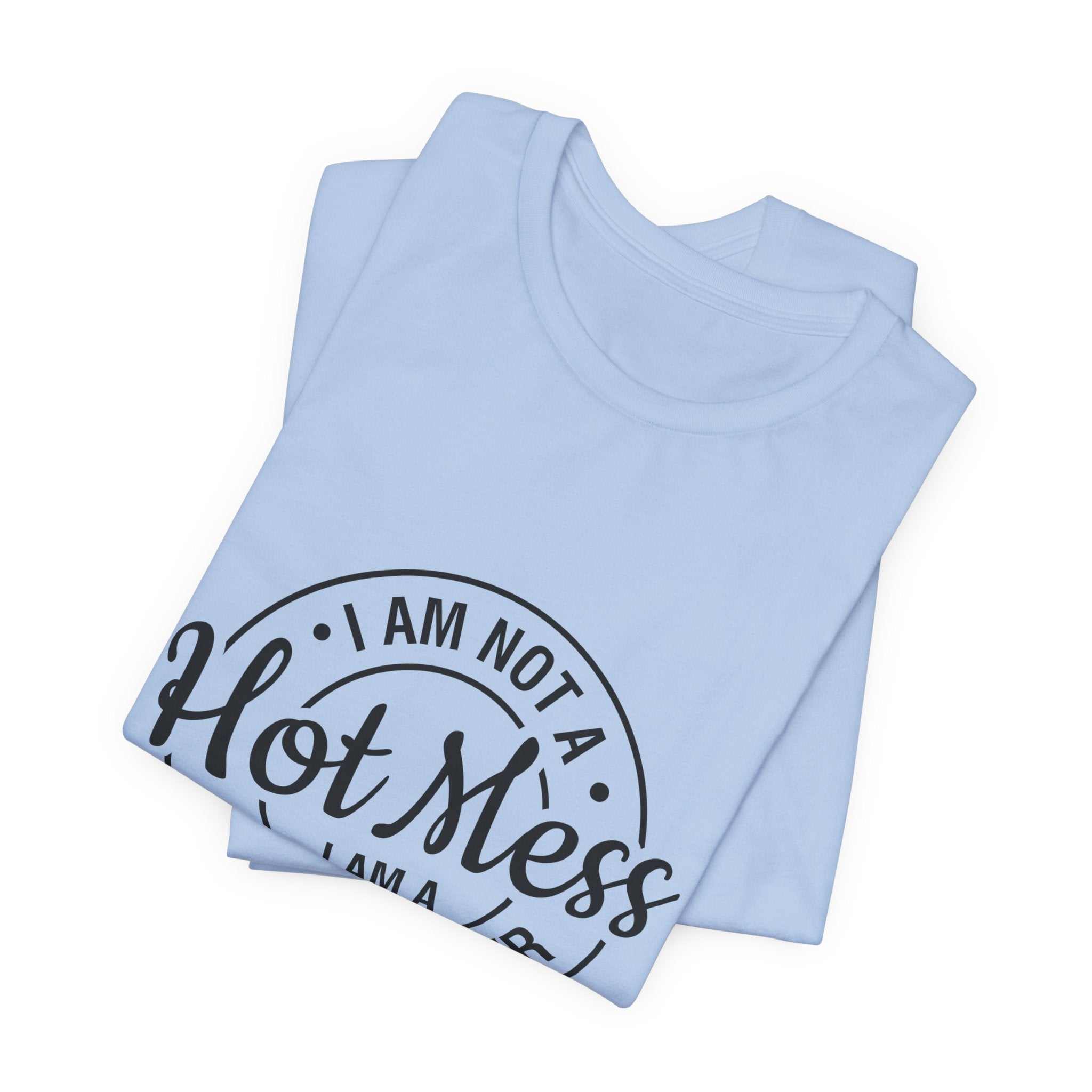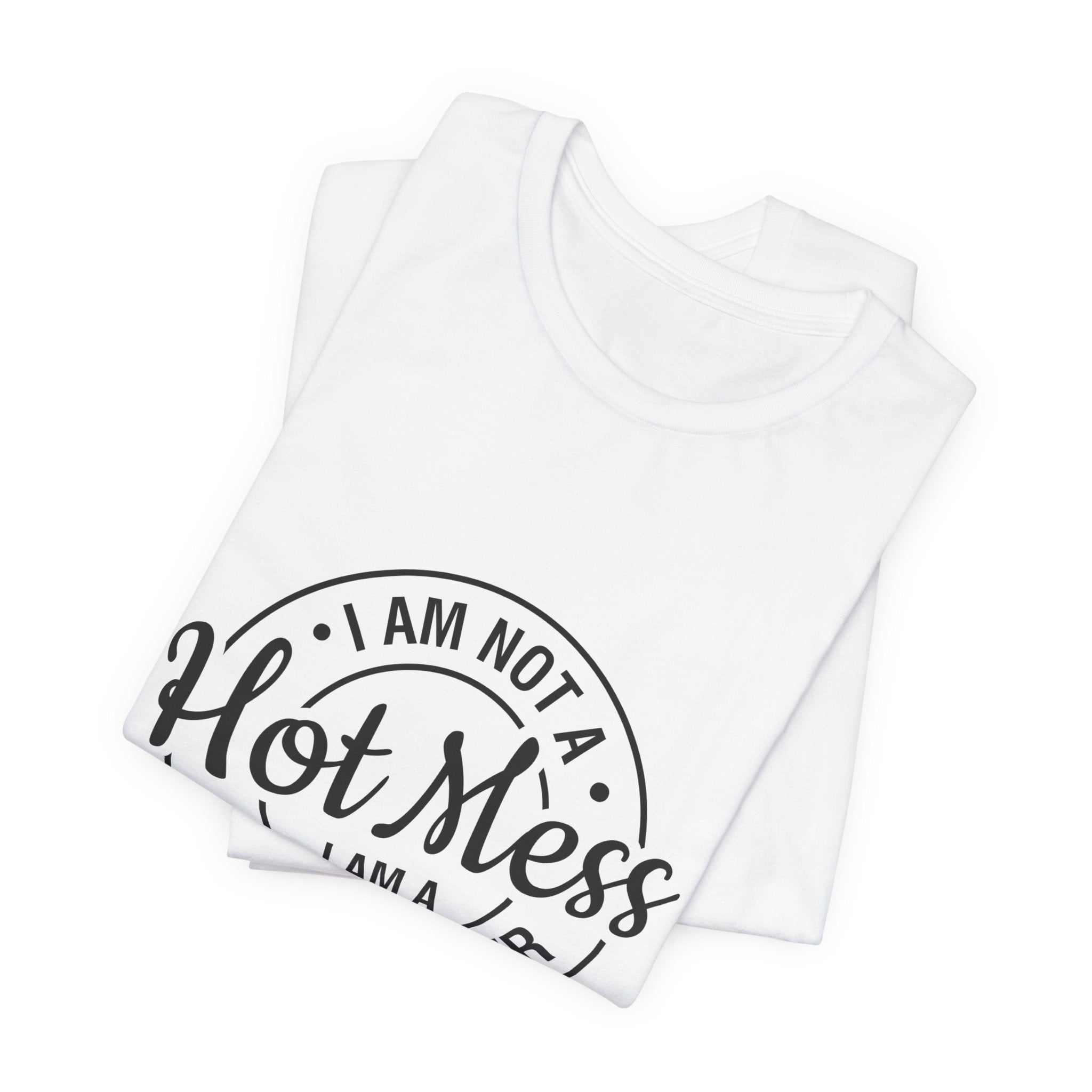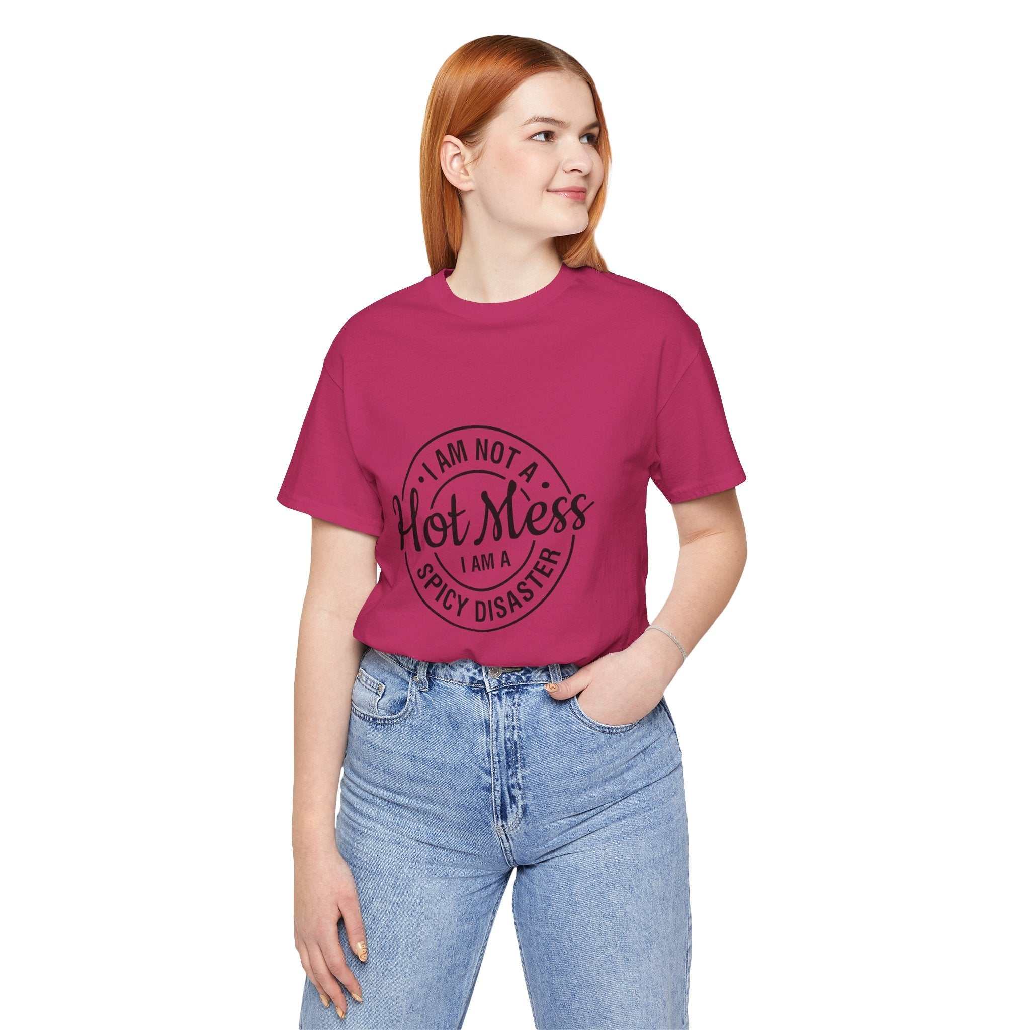 S M L XL 2XL 3XL Width, in 18.00 20.00 22.00 24.00 26.00 28.00 Length, in 28.00 29.00 30.00 31.00 32.00 33.00 Sleeve length, in 8.90 9.20 9.50 9.70 10.00 10.40 Size tolerance, in 1.50 1.50 1.50 1.50 1.50 1.50 This lightweight jersey tee carries a cheeky, hand-lettered badge that reads "I am not a Hot Mess — I am a Spicy Disaster." The soft, breathable cotton keeps you comfortable through errands, kitchen experiments, and late-night takeout runs while the subtle monochrome print adds playful attitude without shouting. It layers easily under a denim jacket or slips on solo for an off-duty look that says you’re confident, a little chaotic, and fully embracing it. The retail fit and classic crew neckline make it simple to style for everyday wear or casual gatherings where humor and personality matter more than polish.
