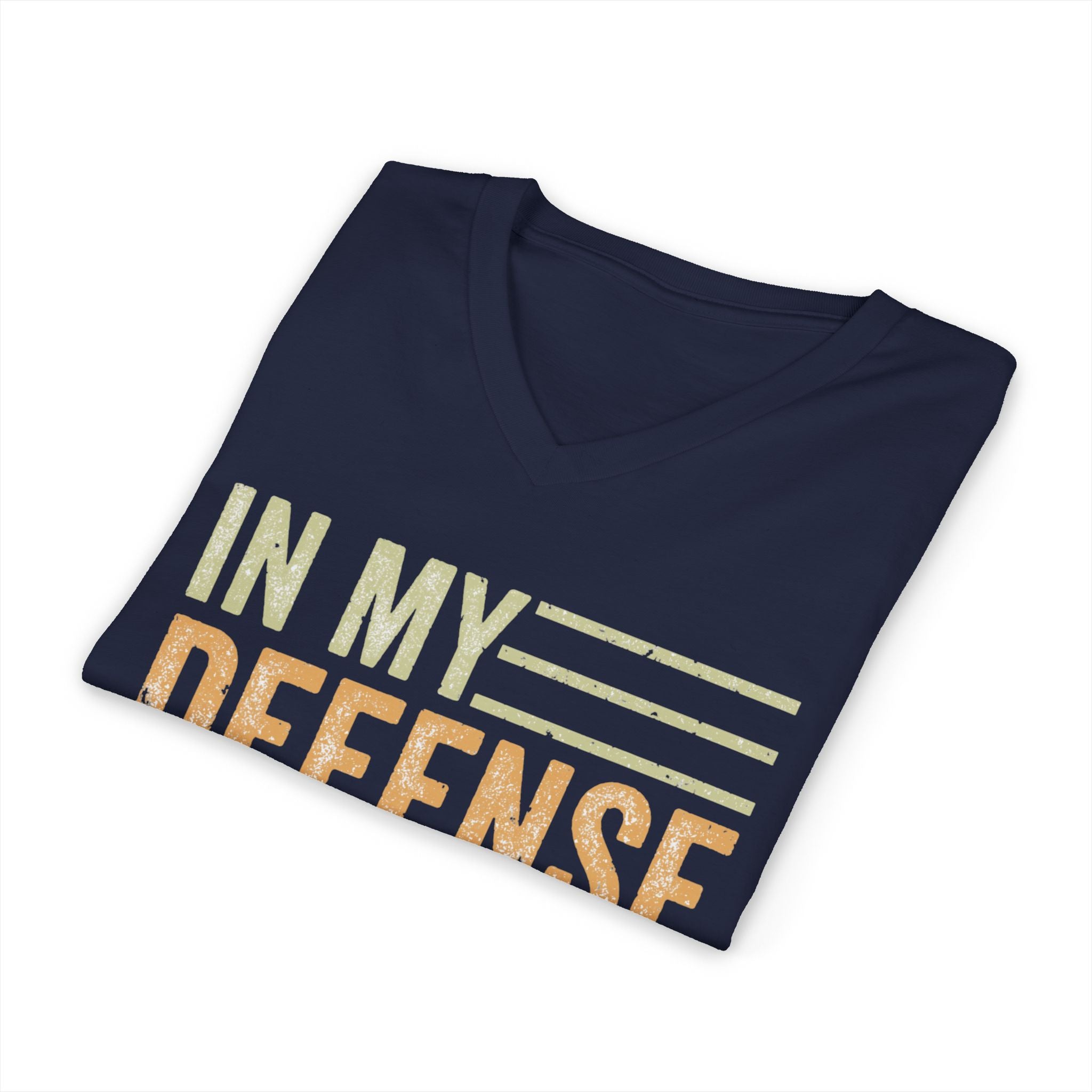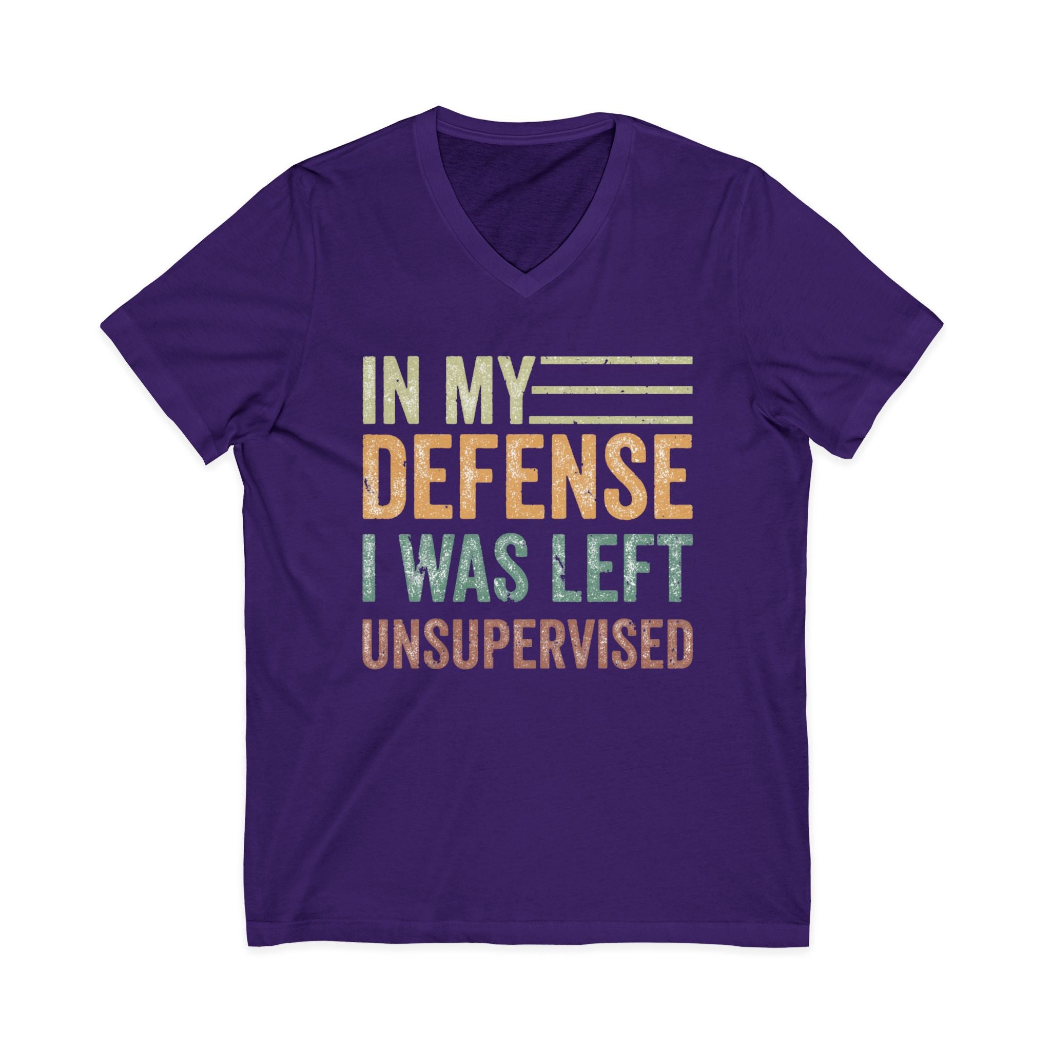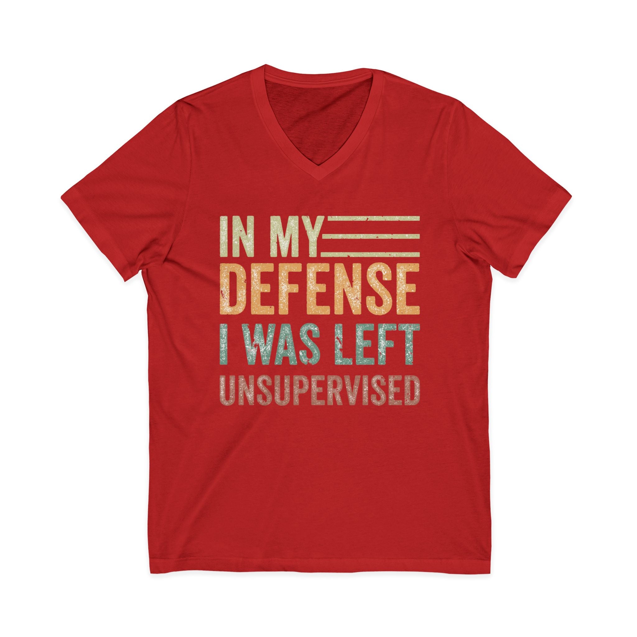 XS S M L XL 2XL 3XL Width, in 16.50 17.99 20.00 22.01 23.98 25.98 27.99 Length, in 26.73 27.72 28.74 29.72 30.75 31.73 32.72 Sleeve length, in 8.62 8.90 9.17 9.45 9.72 10.00 10.39 Lightweight and soft, this V-neck tee carries a playful, slightly rebellious message in worn, sun-faded colors: “IN MY DEFENSE I WAS LEFT UNSUPERVISED.” It feels lived-in from the first wear — a comfortable staple that sits neatly with a retail fit and flattering V neckline. The subtle distressed print and airy fabric make it easy to layer under a cardigan or wear solo on warmer days. Ethically made and responsibly produced, it’s a relaxed everyday shirt that speaks with a wink and slips effortlessly into a casual weekend wardrobe or a relaxed get-together.