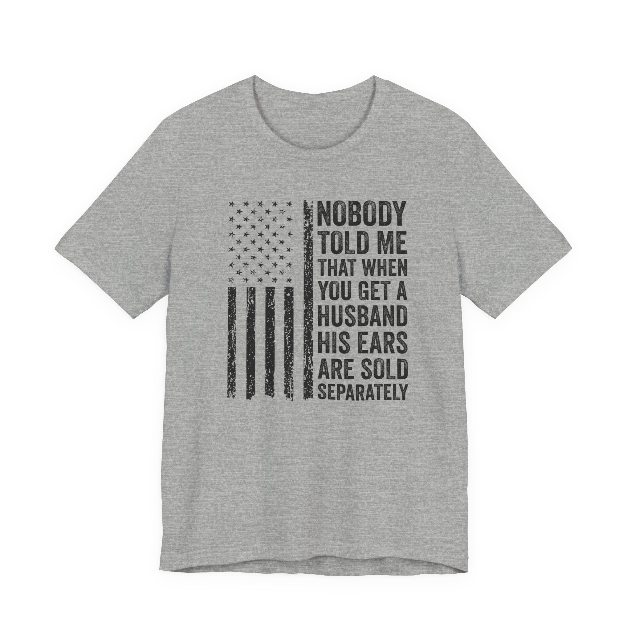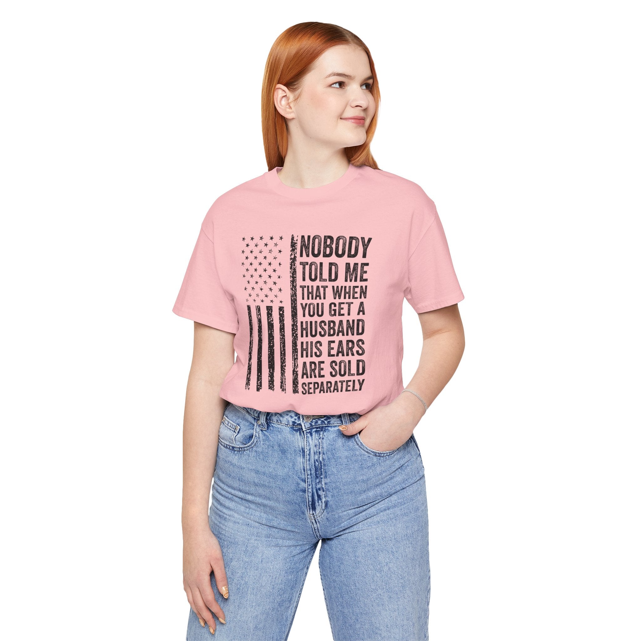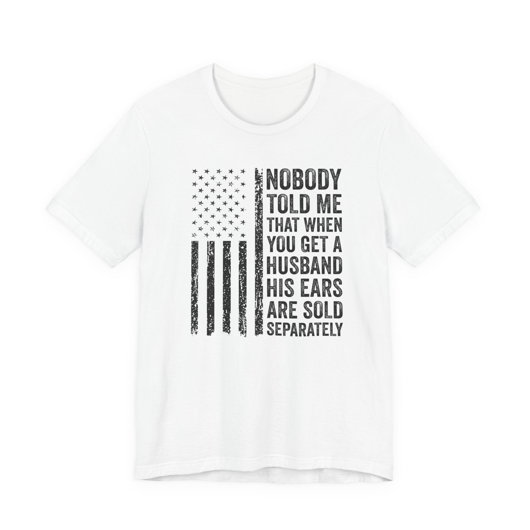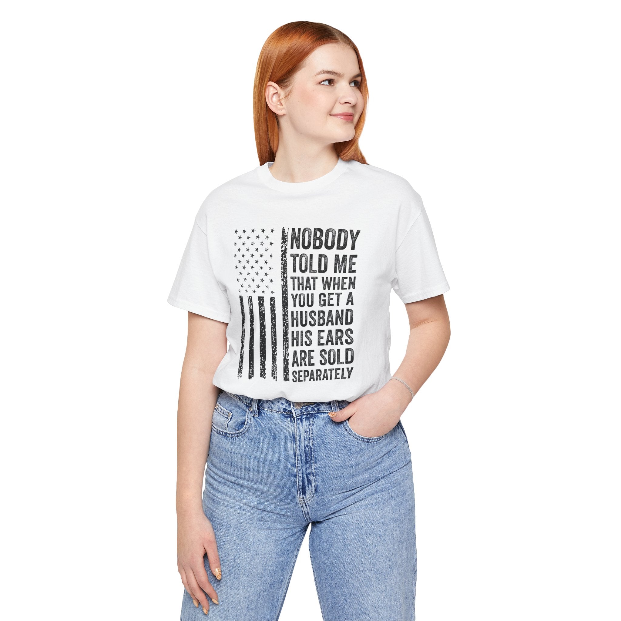 This lightweight jersey tee carries a wink and a roar—bold text declaring "Nobody Told Me That When You Get a Husband His Ears Are Sold Separately" set against a patriotic flair. It wears like a casual statement: breathable Airlume cotton that moves with you, a crisp crew neck that stays neat, and a clean retail fit that layers easily from backyard barbecues to backyard debates. The printed sleeves and label retain sharp detail, while durable side seams and shoulder taping keep the shirt looking sharp after many wears. Made with ethical manufacturing standards and REACH-compliant materials, this tee blends comfort, attitude, and attention to quality for adults who love humor that lands with a wink rather than a whisper.