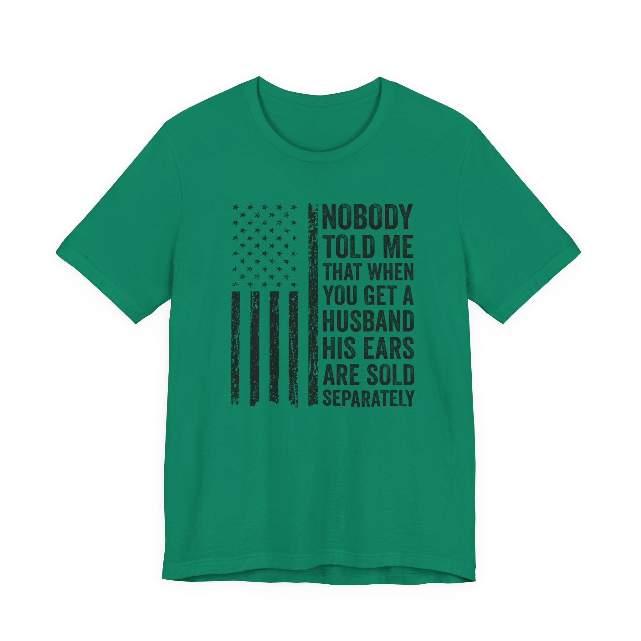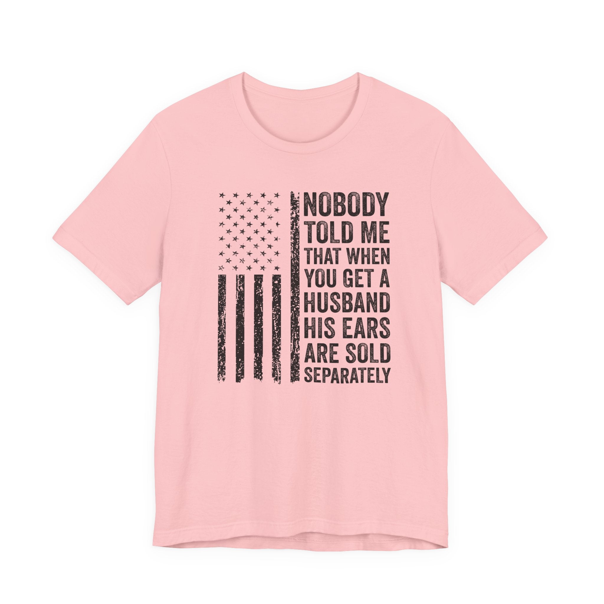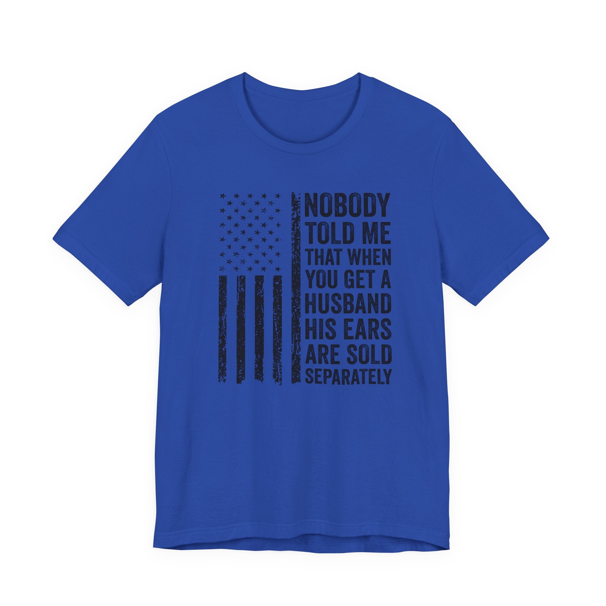 This lightweight jersey tee carries a wink and a roar—bold text declaring "Nobody Told Me That When You Get a Husband His Ears Are Sold Separately" set against a patriotic flair. It wears like a casual statement: breathable Airlume cotton that moves with you, a crisp crew neck that stays neat, and a clean retail fit that layers easily from backyard barbecues to backyard debates. The printed sleeves and label retain sharp detail, while durable side seams and shoulder taping keep the shirt looking sharp after many wears. Made with ethical manufacturing standards and REACH-compliant materials, this tee blends comfort, attitude, and attention to quality for adults who love humor that lands with a wink rather than a whisper.