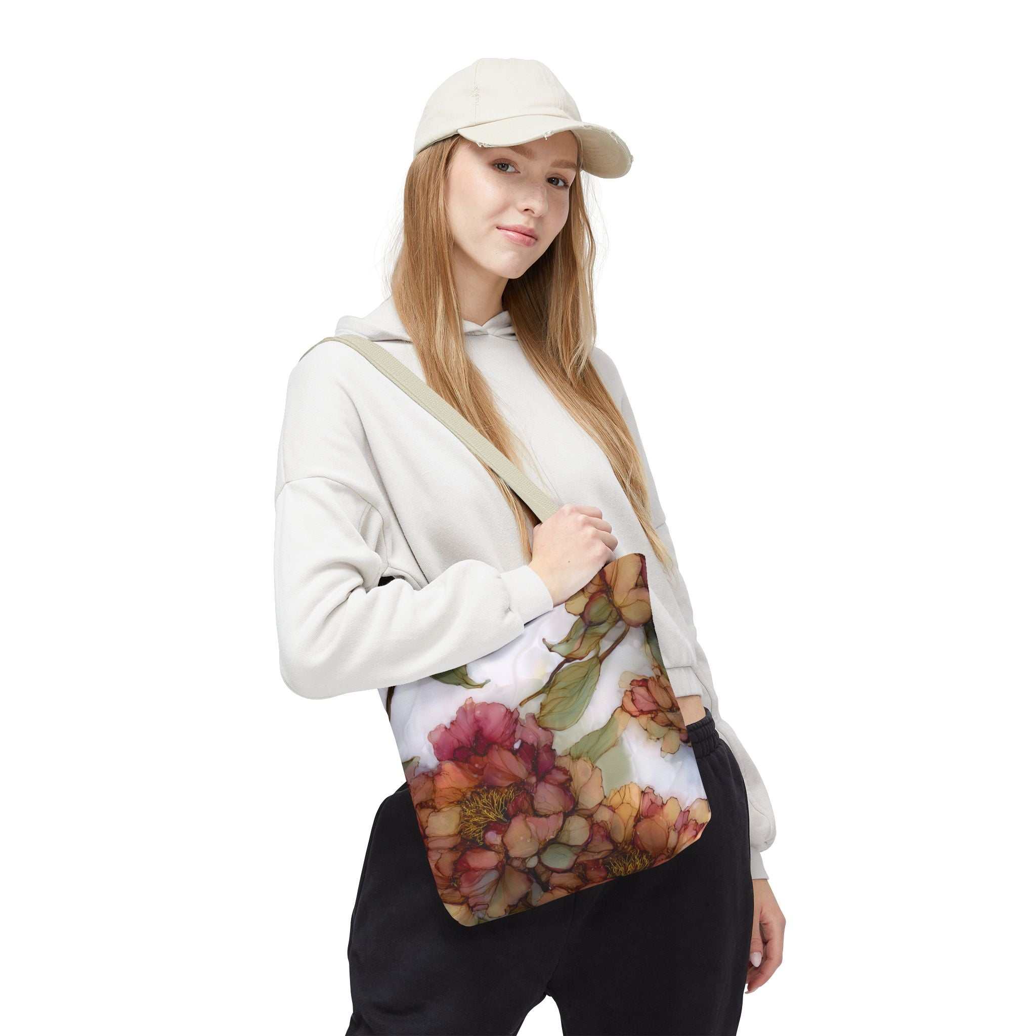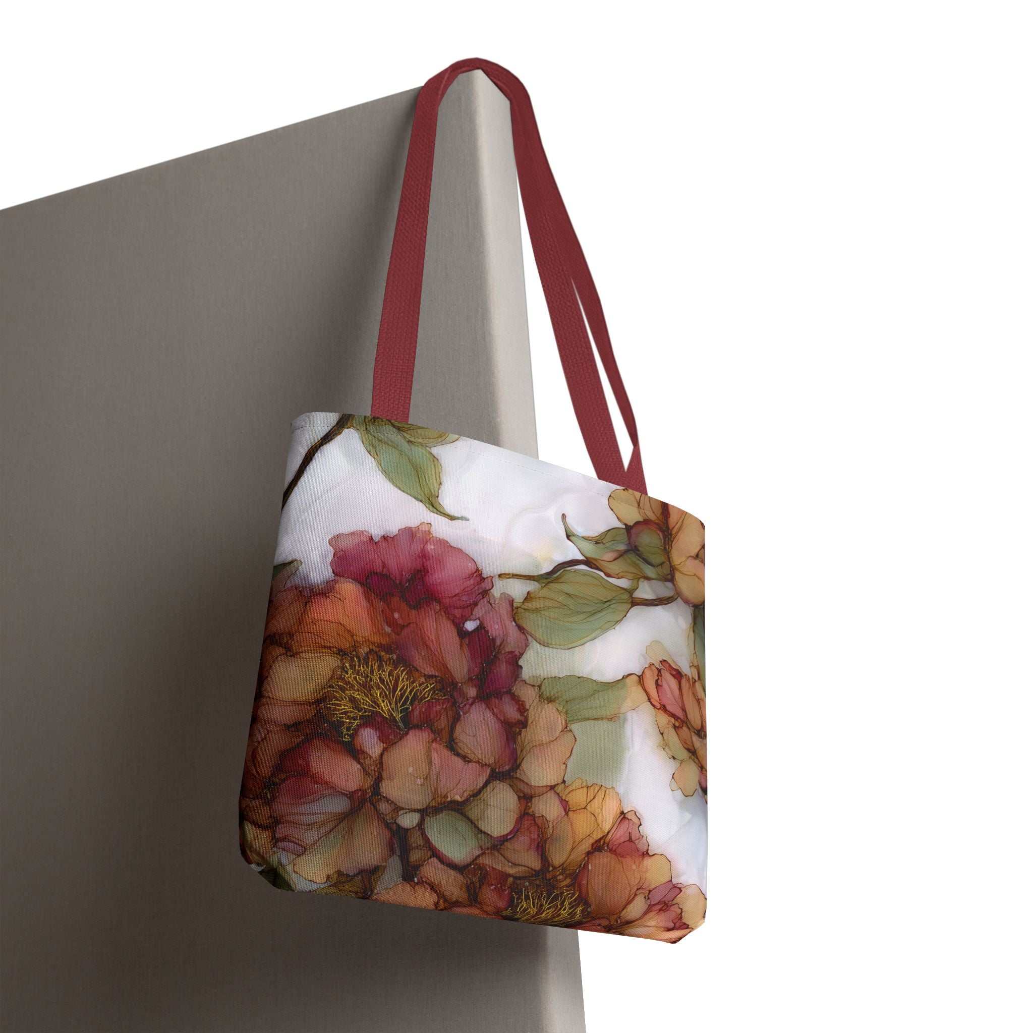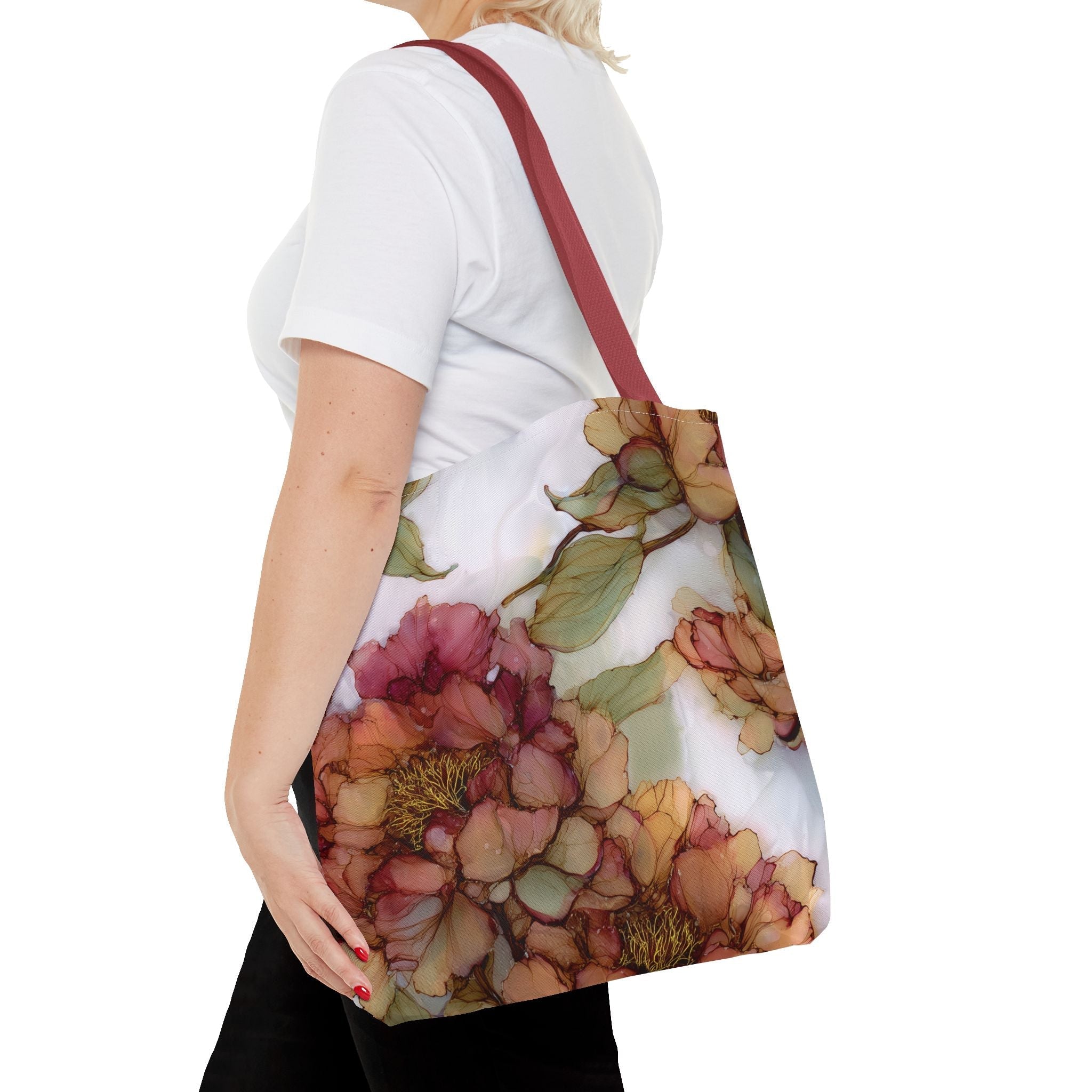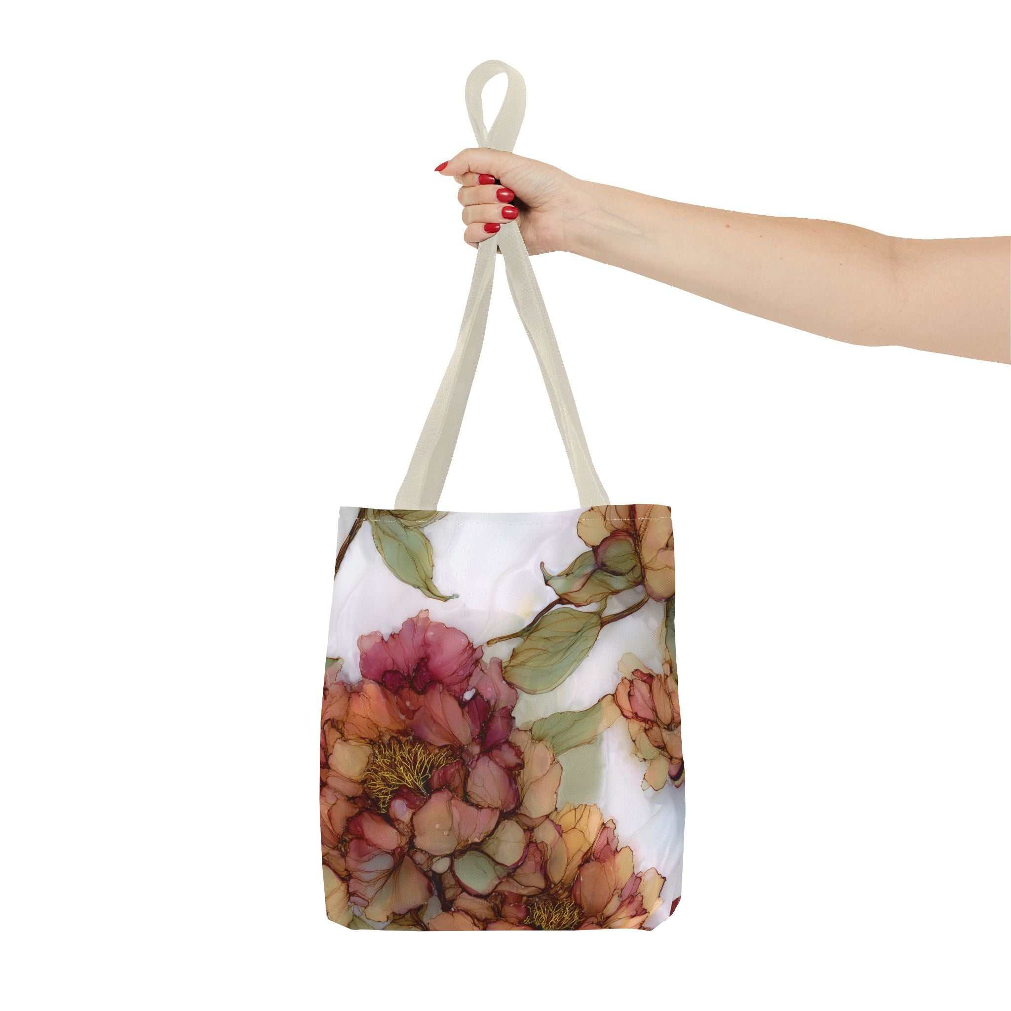 Carry a soft, painterly garden wherever you go. This roomy polyester tote features watercolor-style blooms in warm rose, apricot and olive tones that feel like a sunlit afternoon in an old greenhouse. The boxed corners and reinforced handle stitching give it everyday strength, while the lightweight, quick-drying fabric keeps the bag easy to fold and store between uses. Choose from several handle colors to match your look — the print wraps fully across the front and back, so the floral art reads beautifully from every angle. Slip in a book, market finds, or a light sweater and head out with an effortless, vintage-inspired touch.